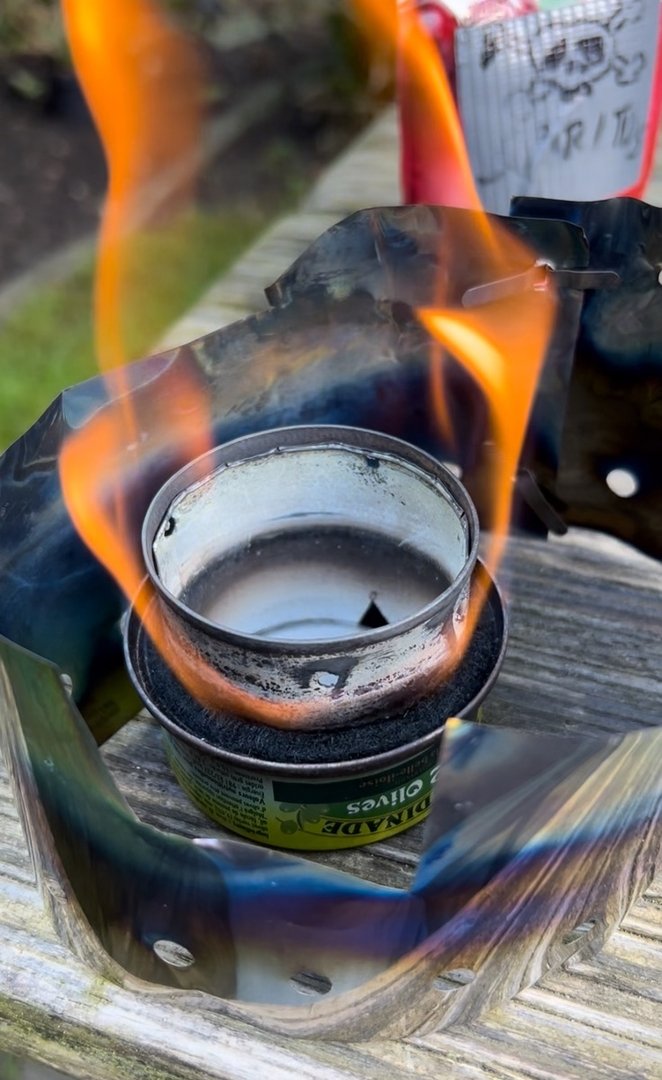 Mei leicht windigem Wetter, braucht dieses schmucke stück DIY Gear, was ich unter Schweiß und extremster körperlicher Anstrengung, selbst gebastelt habe, 7 Minuten, um 200ml Wasser sprudelnd zum Kochen zu bringen und hat dann noch 2 Minuten weiter gebrannt. Mit 2cl Spiritus.