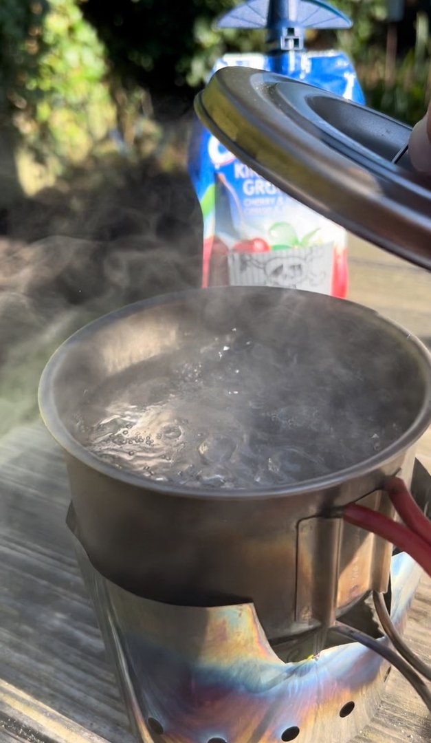 Er braucht 6,5 Minuten, um 200 ml Wasser zum Kochen zu bringen, bei relativ windigem Wetter.
