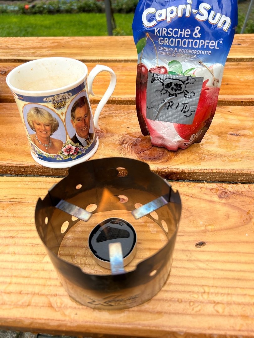 Der X-Boil braucht mit 2cl Spiritus ca 7,5 Minuten, bei ebenfalls leicht windigem Wetter, um das Wasser zum Siden zu bringen und geht dann aus, ohne das Wasser zum Kochen zu bringen.