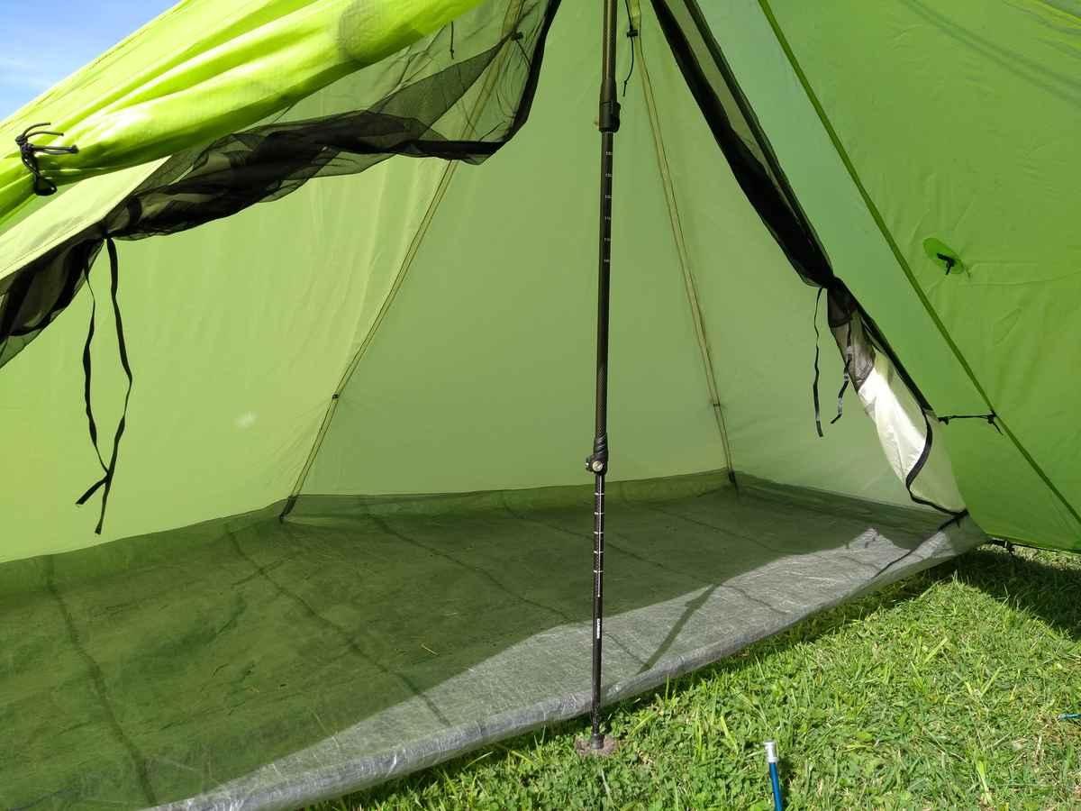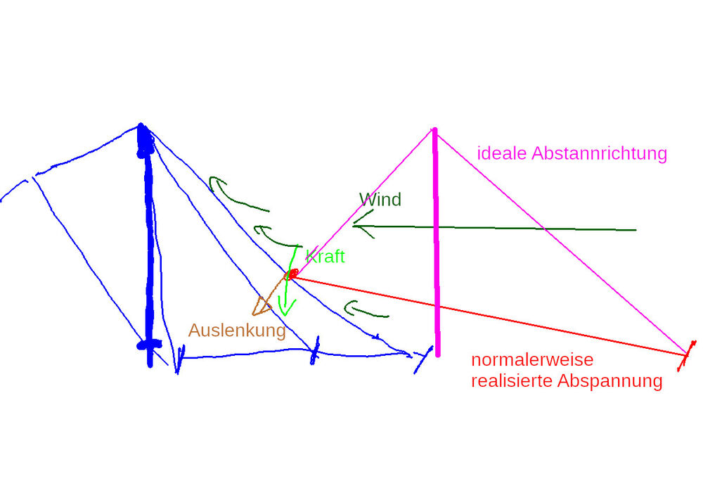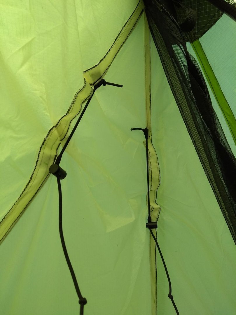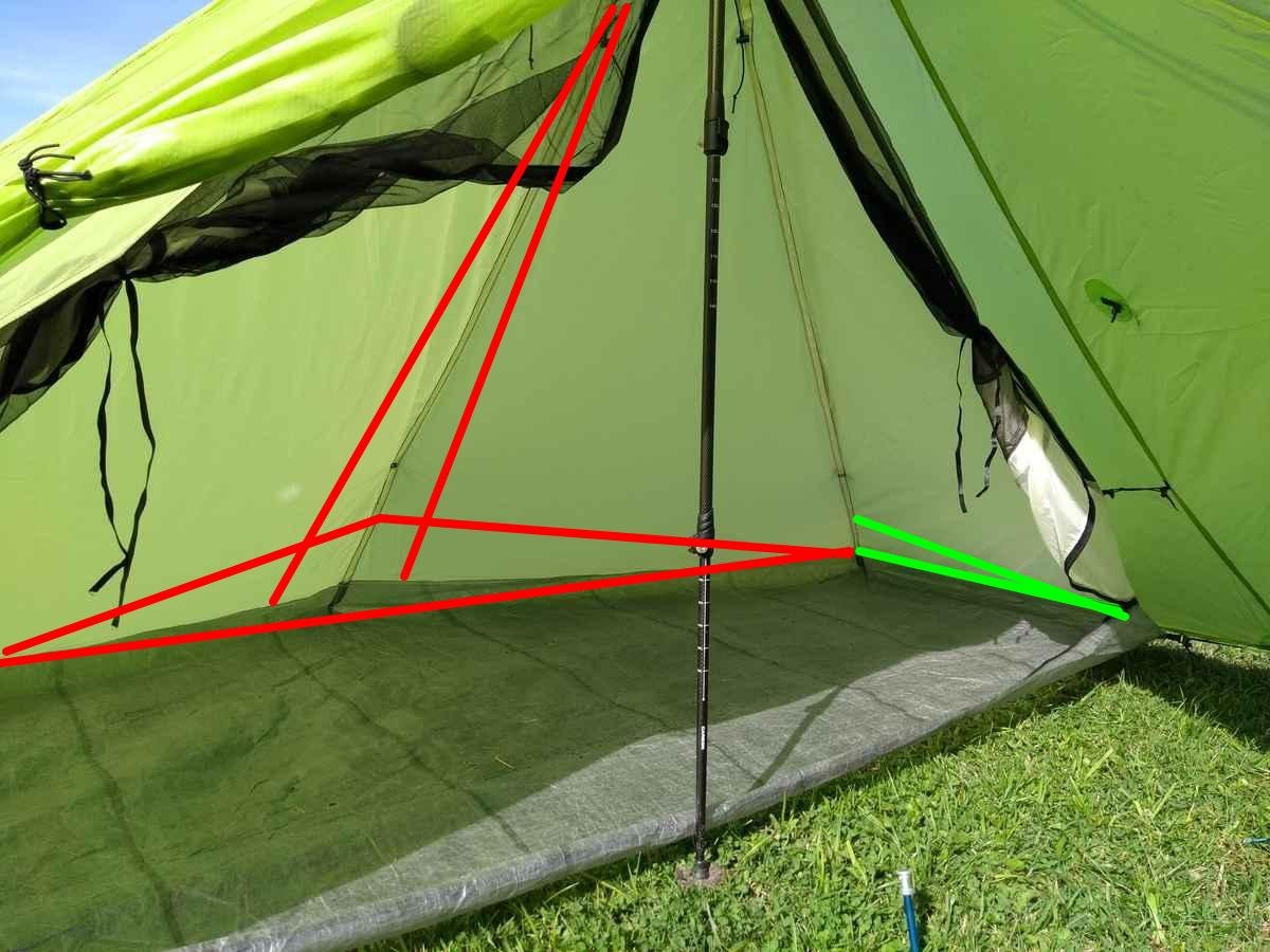 Das Innenzelt krankt daran, dass es nur stramm steht, wenn die Spitze zum Eingang hin geneigt ist, also die Front nicht senkrecht ist sondern quasi "überhängend".