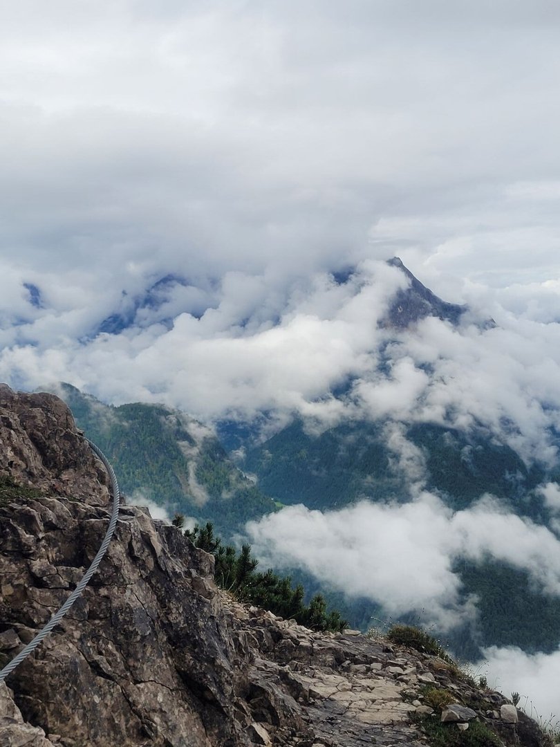 Ich war zurück am Beginn des 2. Teils, dort gabelte sich der Weg und ich hatte dort die Möglichkeit, direkt ins Tal abzusteigen... ich lauschte weiter nach dem Gewitter, da das Donnern auf einmal wieder leiser wurde, prüfte ich das Wetter sowohl über meine Wetterapp, als auch über mein Garmin Inreach Mini. Das Gewitter zog immer weiter weg und ich brachte es nich fertig, den Abstieg anzugehen... ich kam doch für den Klettersteig... ich überlegte hin und her... hin und her... auf der einen Seite wollte ich unbedingt diesen Klettersteig machen, aber ich wollte auch nich leichtsinnig sein und mein Leben riskieren. Ich schaute in den Himmel und sah, dass es wieder deutlich heller wurde, daher entschloss ich mich, es nochmal zu versuchen und stieg zurück in den Klettersteig ... zum Glück... denn der Regen verzog sich und klatsch nass kletterte ich dort nun also fröhlich am Grat rum und freute mich des Lebens.