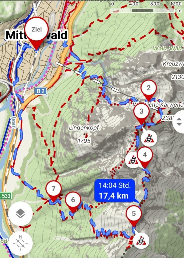 *meine Uhr zeigt 14 h an, weil ich während meiner Pause im Karwendelbräu die Aufzeichnung pausiert hatte, tatsächlich war ich aber fast 15 h unterwegs.