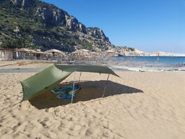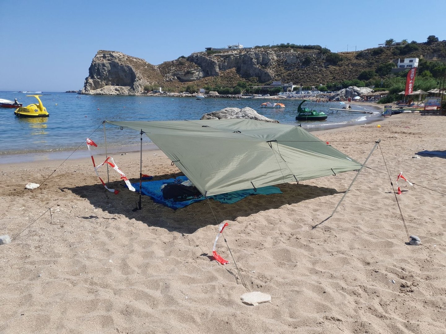 Uns hat der Aufbau sehr gut gefallen und wir werden es genau so wieder verwenden. Ich war schon beeindruckt, dass die Heringe erstaunlich gut im Sand hielten. In dem 14 tägigen Urlaub herrschten in der ersten Woche Höchsttemperaturen von 39 bis 41°C und wir waren häufig direkt nach dem Mittag bis zum Abend am Strand. Der Sand war dabei so heiß, dass man nicht Barfuß gehen konnte. Unterm Tarp mit Decke konnten wir problemlos sitzen. Wir hatten zu dritt, 2 Erwachsene und ein Kind, mehr als genügend Platz und es reichte auch noch locker für eine Sandburg unter dem Tarp.