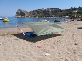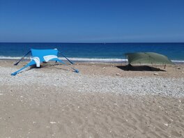 Es ist noch ein Bild entstanden, dass mal den direkten Vergleich zwischen einem Strandzelt und meinem Aufbau zeigt. Das Strandzelt ist mit Steinen in den dafür vorgesehen Taschen gefüllt. Der Schattenbereich war unter meinem Aufbau größer. Ich habe die Personen auf dem Bild unter dem Strandzelt entfernt, deswegen ist der Schattenbereich nicht mehr vollständig zu erkennen.