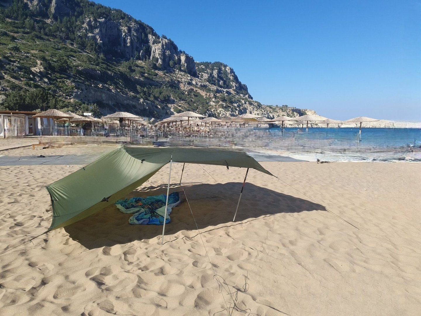 Meine größte Sorge war, dass die Heringe im Sand nicht halten würden. Die Beschaffenheit des Strands war unterschiedlich. Weit weg vom Meer war es teilweise sehr hart, sodass kein Hering in den Boden ging. Weit vorn war der Sand leicht feucht und die Heringe hielten besser. In den Bereichen dazwischen konnte man die Heringe ohne weiteres einfach mit der Hand komplett 30cm in den Boden schieben und wieder heraus ziehen. Einmal habe ich das Tarp bei stärkeren Wind aufgebaut und der Wind hat während des Aufbaus, auch mal einen Hering aus dem Sand gezogen. Erst als alles stand, hielt es fest. Ich hatte den Eindruck dass der Aufbau auch in sich eine gewisse Stabilität hatte. Ich habe immer versucht die Guylines möglichst weit weg vom Tarp zu spannen, vor allem die Hinteren. Mein Aufbau hielt Wind mit einer Geschwindigkeit von 30km/h in sehr weichen Sand stand. Es hat dabei die eine Tarphälfte, die etwas schräg gegen die Sonne und Wind gerichtet war, tief eingedrückt und den Platz unterm Tarp verringert. Wenn ich am Strand Steine gefunden habe, habe ich die Steine als Beschwerung oben auf die Heringe gelegt.