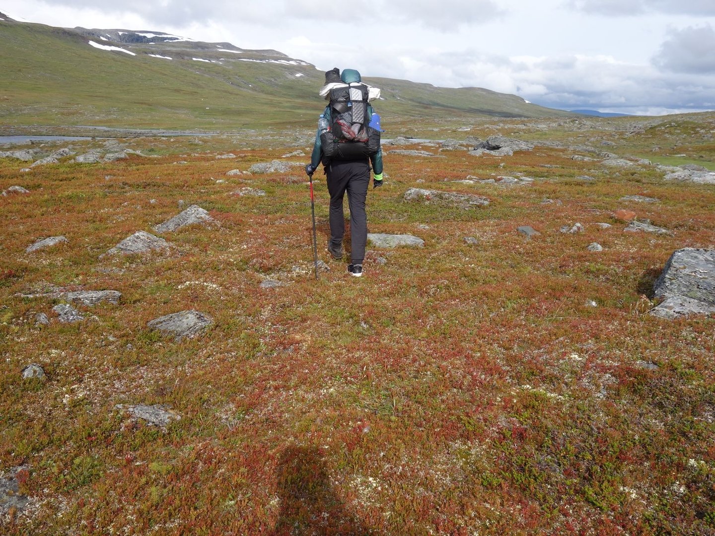 Zurück an der Hütte entschloss ich mich, den Stiefel am rechten Fuß auszuziehen und fortan den Watschuh meines Vaters zu tragen, einen Sneaker mit Mesh. Dies war absolut essentiell, da sich der Weg nach der Kutjaurestugan auf etwa 2-3 km einen Berg hinaufschlängelte, und die Achillessehne vor allem beim Bergauflaufen schmerzte. Der Sneaker saß jedoch deutlich lockerer an der Ferse und tat daher gut, auch wenn ich nun vermehrt darauf achten musste, wo ich hintrat. Nachdem wir am Vortag schon ein wenig Sonne abbekommen hatten, wurde es an diesem Tag nur noch besser. Zwar ging ein ziemlicher Wind, aber der Sonne-Wolken-Mix dieses Tages war bis dato das beste Wetter der Wanderung. Nach dem Aufstieg gelangten wir in ein schmales Hochtal, das uns bis zum Folgetag beherbergen sollte. Am Berg und nun auf dem Plateau zeigten sich schon einige Herbstfarben, wie ich entzückt feststellen konnte (tatsächlich war ich noch nie im Herbst in Lappland - ein Zustand, den ich hoffentlich in den nächsten Jahren ändern werde).