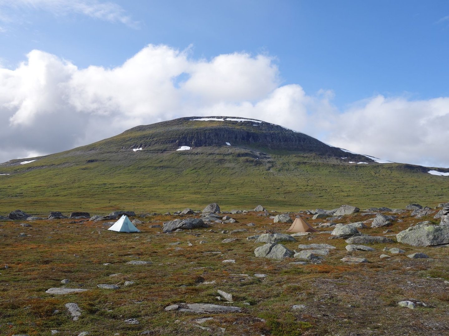 In Anbetracht unserer geringen Reststrecke sahen wir uns schon frühzeitig nach geeigneten Zeltplätzen um, die jedoch rar gesät waren: Entlang des Gårssåjávrre war jeder ebene Fleck entweder nass oder windexponiert, weshalb wir bis zum gleichnamigen Wintershelter liefen, wo wir gegen 14.30 ankamen. Zu unserer Verwunderung war die Hütte trotz der frühen Tageszeit belegt, ein Mann saß im Eingang, seine Sachen weit verteilt. Zum Glück erspähte ich in der Nähe doch ein halbwegs windgeschütztes Fleckchen, weshalb wir problemlos unser Lager aufschlagen konnten.