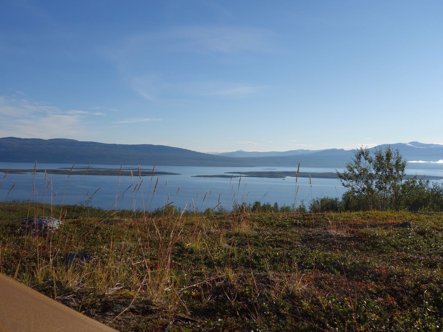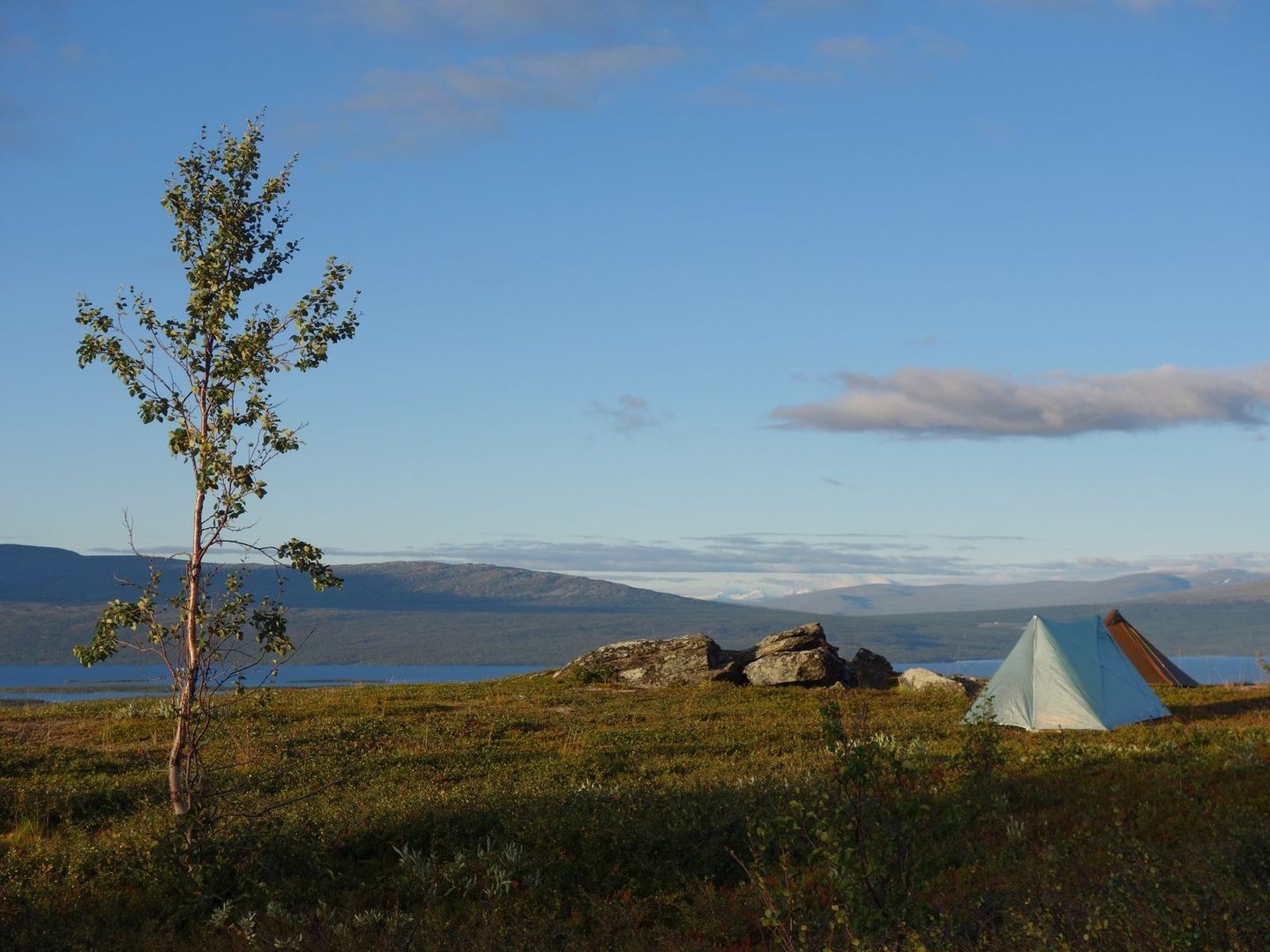 Nachdem wir eine ganze Stunde Mittagspause gemacht hatten, begannen wir den Abstieg, wegen des stark schmerzenden Knies quälend langsam. Trotzdem erreichten wir gegen 14.00 eine Terrasse oberhalb von Vaisaluokta und beschlossen, dort zu bleiben. Zwar hatten wir ursprünglich in Erwägung gezogen, zum Ufer des Akkajaure hinabzusteigen, ich vermutete jedoch (zurecht, wie sich herausstellen sollte), dass dort Zeltplätze rar gesät sein würden. So saßen wir den dritten Nachmittag in Folge ab etwa 14.30 die Zeit ab, immerhin bei traumhaften Panoramen über den Akkajaure.