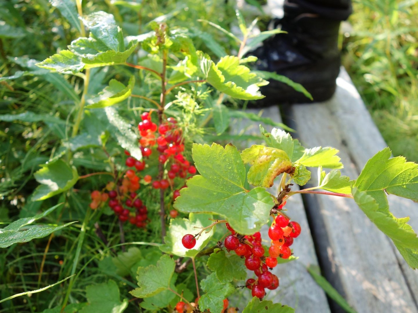 Die kleine Siedlung der Sami, die wie ausgestorben war, ließen wir schnell hinter uns, und fanden uns im Nu auf einem sehr überwachsenen Pfad wieder. Wer meinen Bericht vom Padjelantaleden gelesen hat, wird sich vielleicht daran erinnern, dass ich diesem “Uferdschungel” nicht viel abgewinnen kann: die Hose war permanent nass, da wir uns den Weg durch hüfthohes Gesträuch bahnen mussten. Durch das Wetter fiel das aber Gott sei Dank kaum ins Gewicht, es war noch wärmer als am Vortag. Inmitten des feuchten Waldes trafen wir dann plötzlich auf drei Johannisbeerpflanzen, die wir dort so gar nicht erwartet hatten. Nachdem wir jeder eine Handvoll gefuttert hatten, liefen wir weiter und kamen zunehmend in etwas trockeneren Birkenwald.