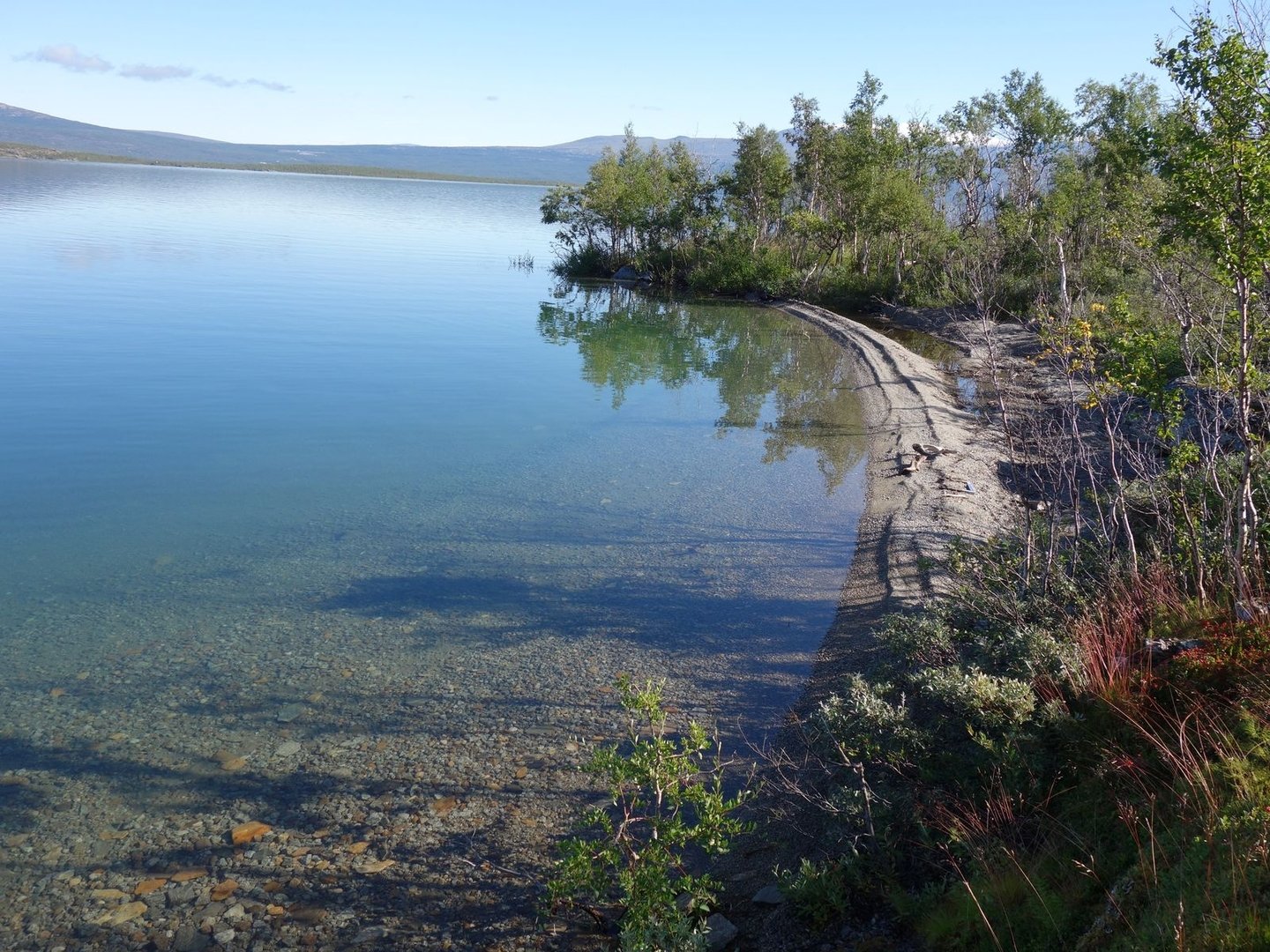 Der letzte Tag unserer Wanderung sollte uns etwa 7 km zur Bootsanlegestelle in Änonjálmme führen, wovon wir nach Ritsem übersetzen sollten, um am Folgetag abzureisen. Abermals offenbarte der morgendliche Blick aus dem Zelt perfektes Wetter. Der Abstieg nach Vaisaluokta im Sonnenschein war entsprechend schön.