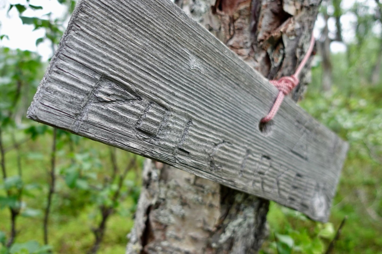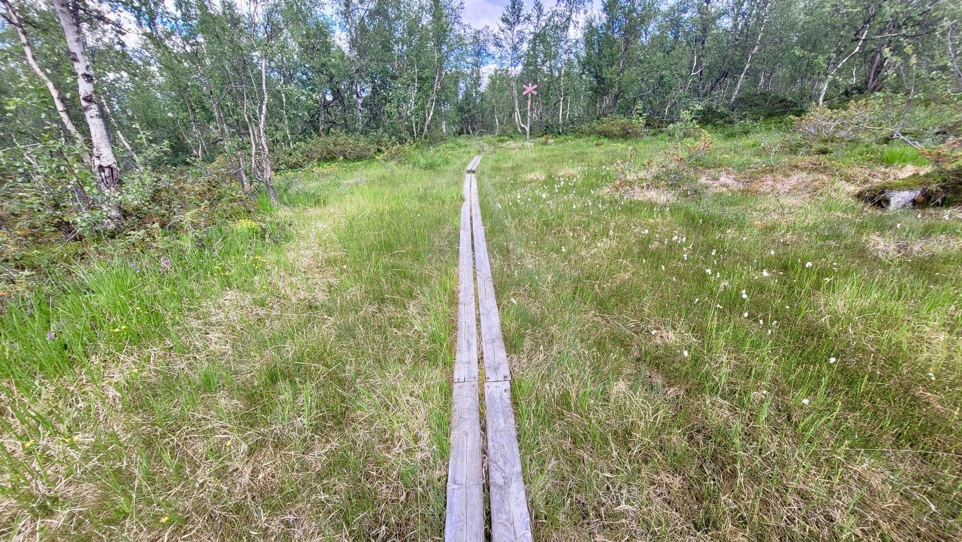 Es dauert etwas, bis ich den Ausgang aus Vuonatjviken und den Kungsleden wieder finde. Zunächst geht es durch Grün, Modder und Gestrüpp in Richtung des ersten Highlight des Tages - der Polarkreis. Langsam aber stetig geht es wieder höher und der Wald wird lichter. Und plötzlich ist es soweit. Ein unscheinbares Holzschild markiert diesen besonderen Punkt.