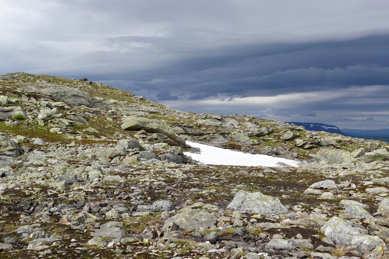 An der Bergflanke entlang geht es weiter über das Fjäll. Mein letzter Schluck Wasser ist getrunken, aber der große Durst noch da. Nur gibt es hier nicht wie sonst überall kleine Bäche. Durstig geht es weiter und ich schiele gierig zum Restschnee auf dem Berggipfel. Immerhin verziehen sich die dunklen Wolken und die Sonne kommt raus.