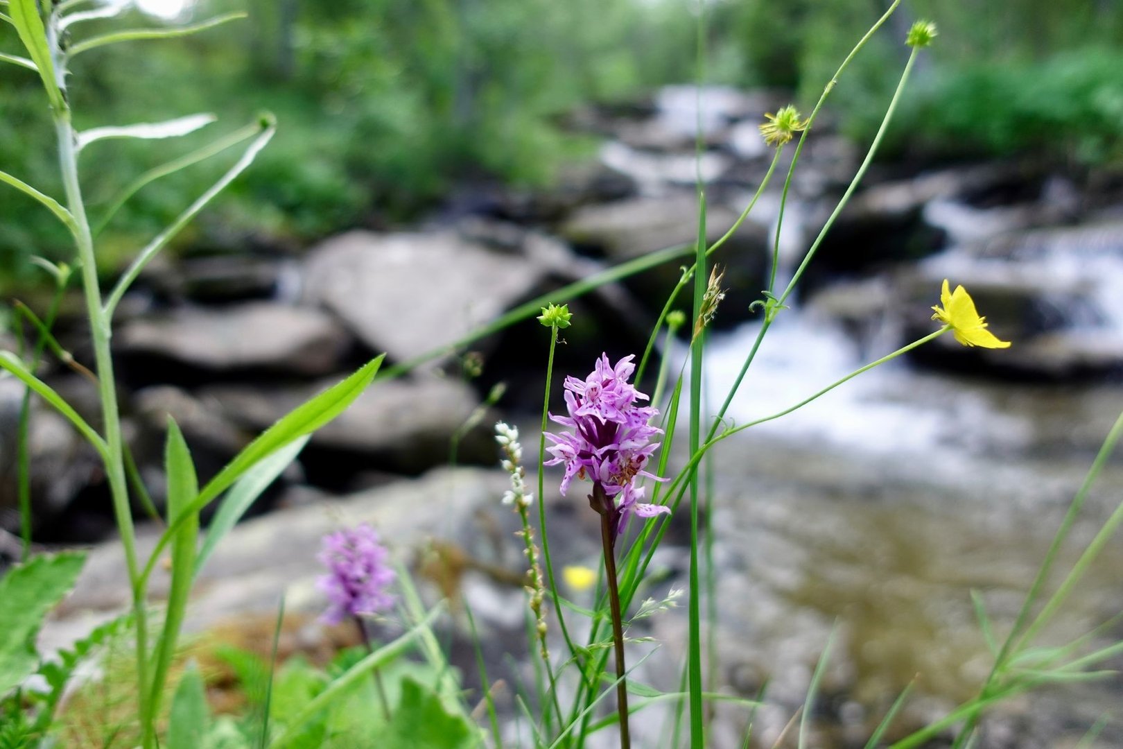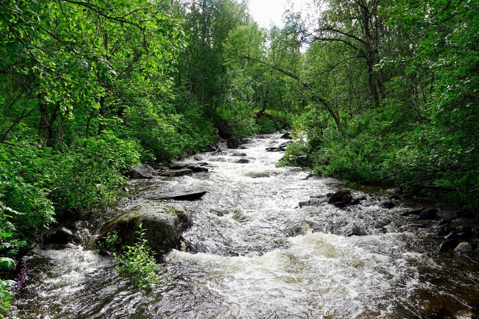 Nach einem Rentier-Gatter geht es noch eine Weile weiter durch den Wald, bis der Weg immer mehr Richtung Fjäll ansteigt. Parallel zu einem Fluss geht es bergauf.