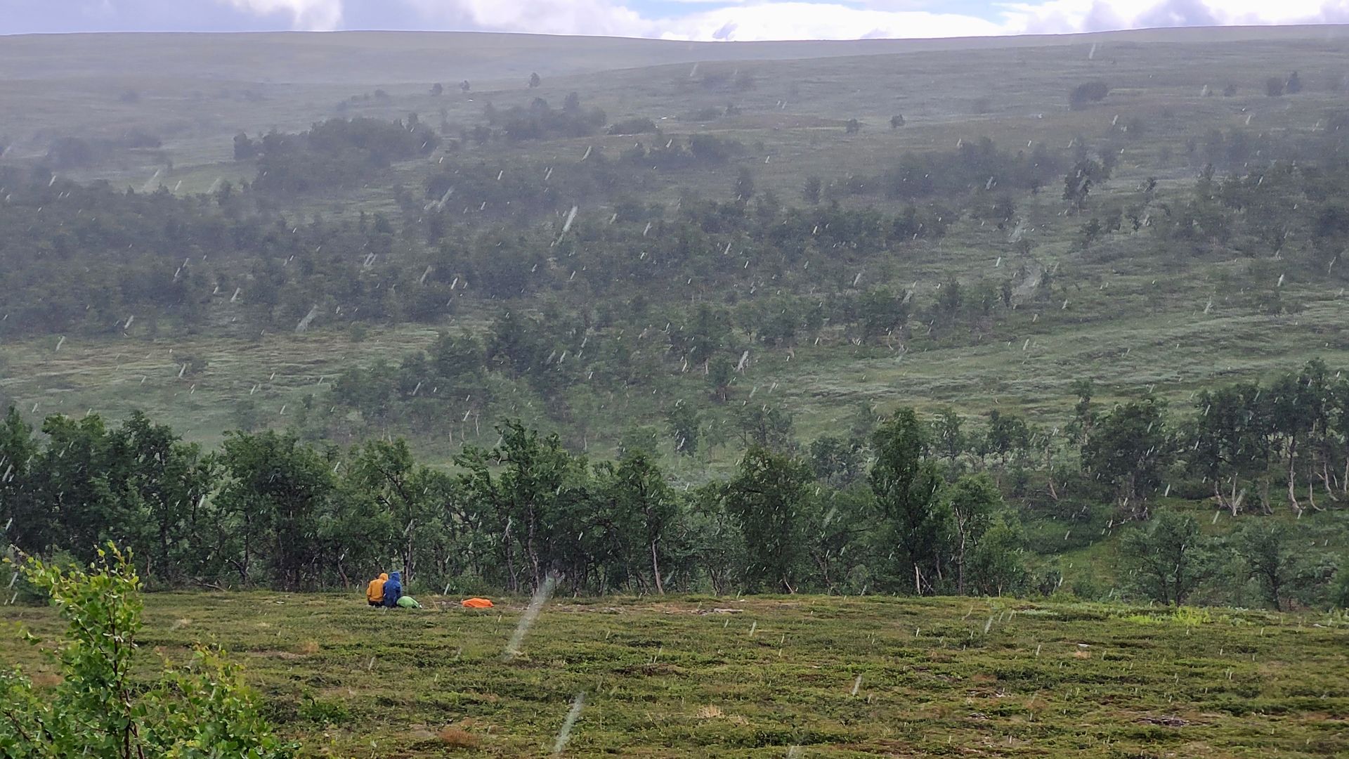 Schließlich biegt der Weg ab rechts runter ins Tal, wo dann am Fluss die Hütte liegt. Auf dem Weg runter gibt es wieder einen kräftigen Schauer, der so romantisch sein muss, dass sich das Niederländische Pärchen erstmal zum Kuscheln aufs Fjäll setzen muss.