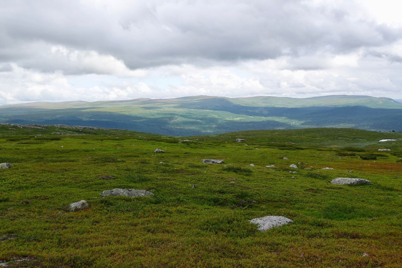 Aus Adolfström raus führt eine geschotterte Forststraße, wie sie aus deutschen Mittelgebirgen stammten könnte. Aber das bleibt nicht lange so, bald laufen wir wieder über die üblichen kleinen felsigen, wurzeligen und matschigen Pfade. Natürlich geht es auch bald wieder bergauf in Richtung Fjäll. Zwischendurch regnet es immer mal wieder, aber nichts wildes.