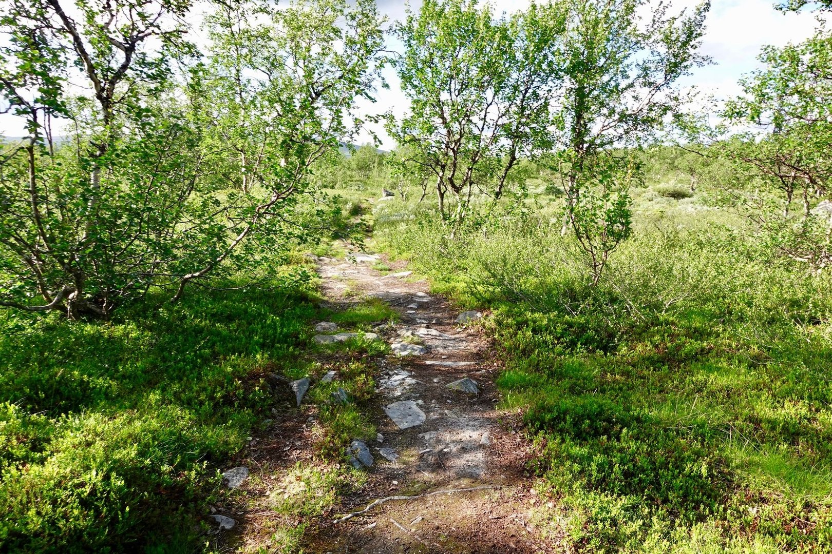 Bald darauf knickt der Weg ab in die Botanik und es geht erstmal ein paar Hundert Höhenmeter bergauf ins Fjäll. Der Wetterbericht hat für den Nachmittag Gewitter vorher gesagt, so dass ich mir nicht zuviel Zeit lassen möchte, um später nicht zu ungünstiger Zeit auf den höchsten Stellen ohne Deckung zu sein.