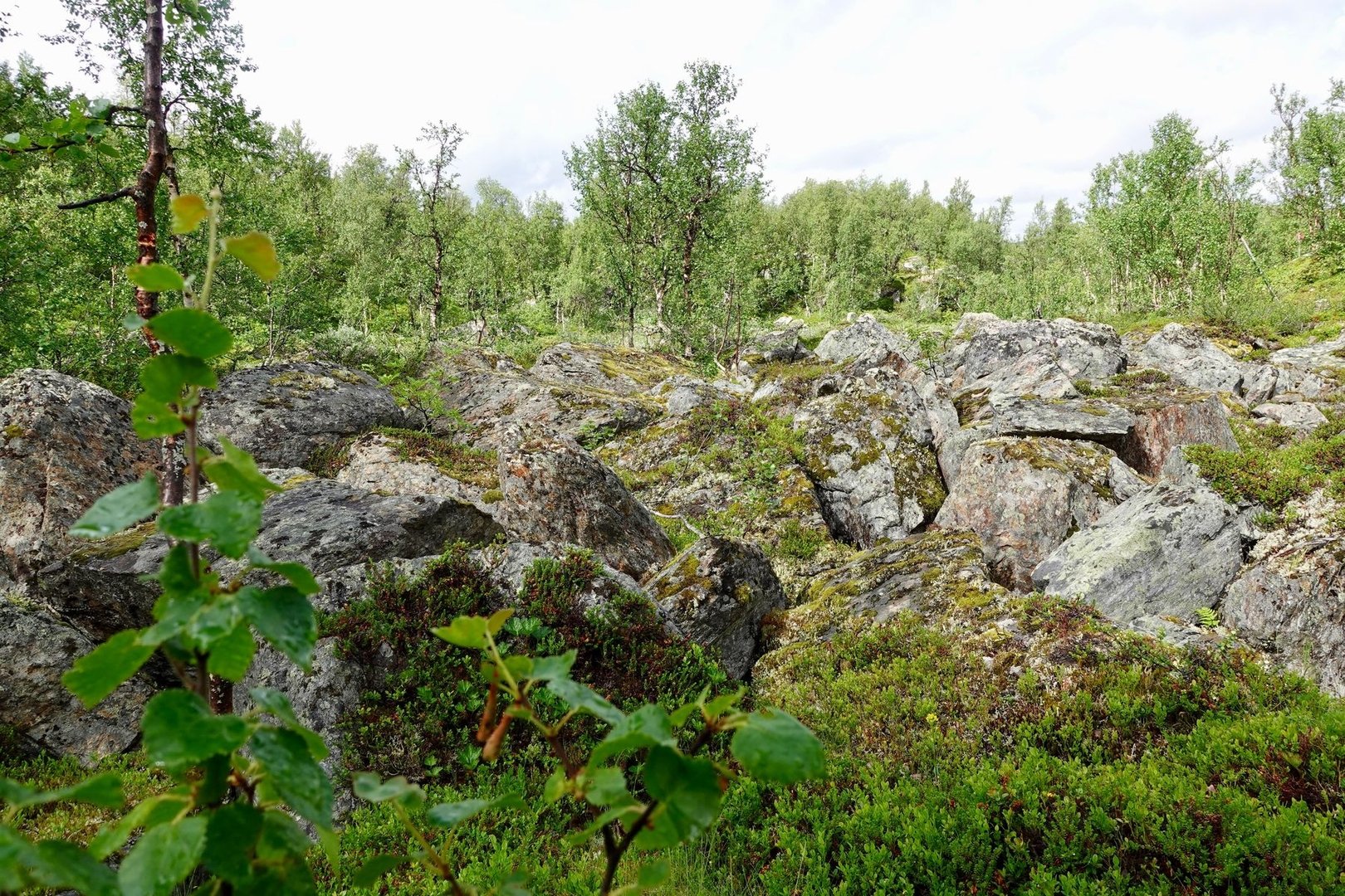 Hinter der Brücke geht es erstmal wieder höher ins Fjäll, um dann nach ein paar Kilometern wieder in lichten Wald einzutauchen.