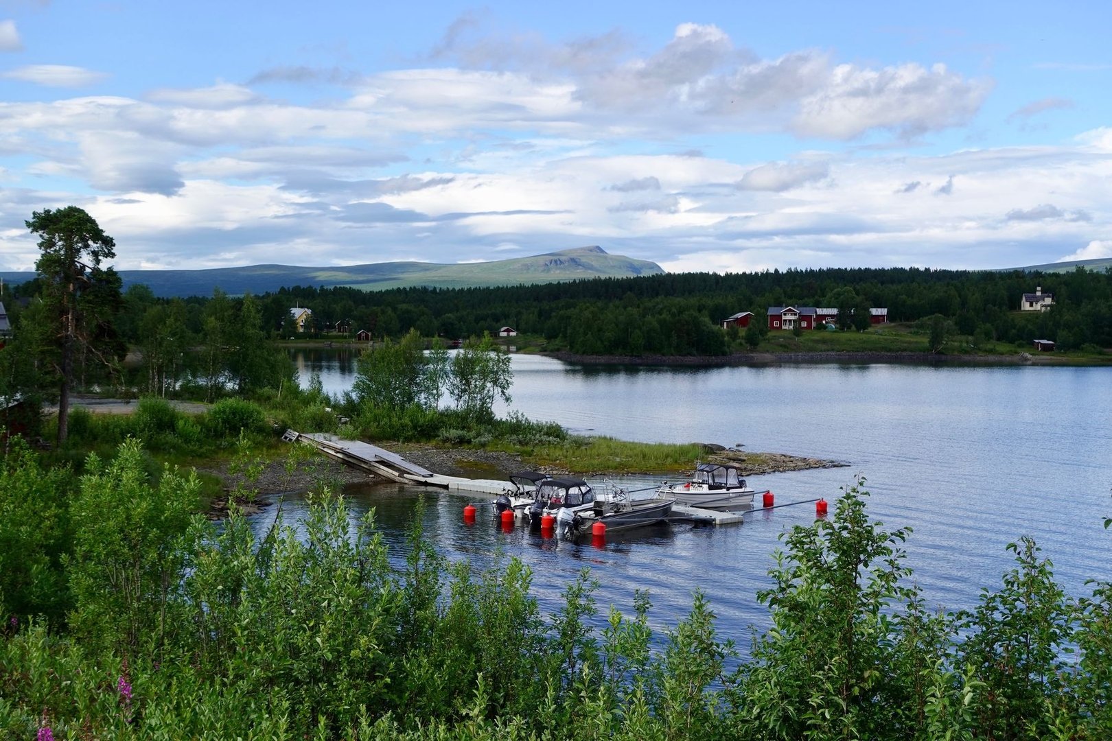 Nach einer rasanten Fahrt legen wir schließlich in Vuonatjviken an und machen uns auf den Weg ins Dorf zum "Büro" zum Bezahlen der Überfahrt. Dort kann man auch ein paar Snacks kaufen, eine Ferienhütte mieten oder auf einer Zeltwiese eine Übernachtung buchen.
