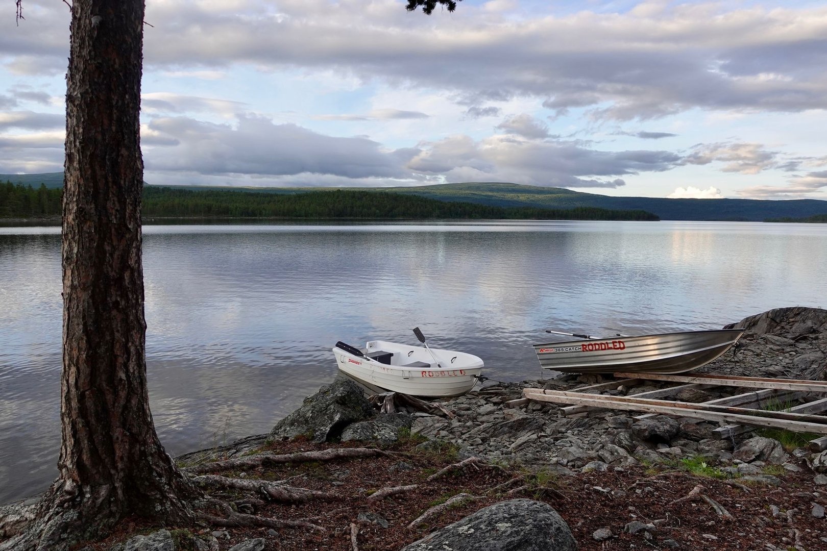 Gerade als ich es mir dann noch etwas auf der Isomatte gemütlich gemacht hatte, schreckt mich der Blick über die Schulter wieder auf, da eine dunkle Wolkenfront heranzieht. Schnell packe ich zusammen und mache mich auf zum Abstieg vom Fjäll wieder runter an den nächsten Bootsanleger, da ist G. auch schon wieder in Sicht. Es geht relativ steil runter in den Wald und schließlich kommen wir an einem Seeufer in Riebnes an, wo vereinzelt ein paar Ferienhäuschen rumstehen.