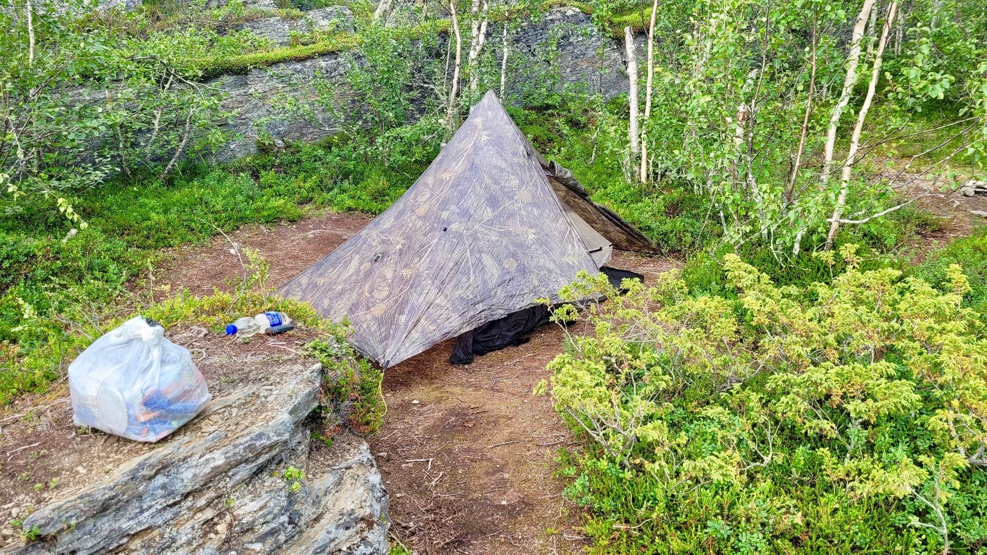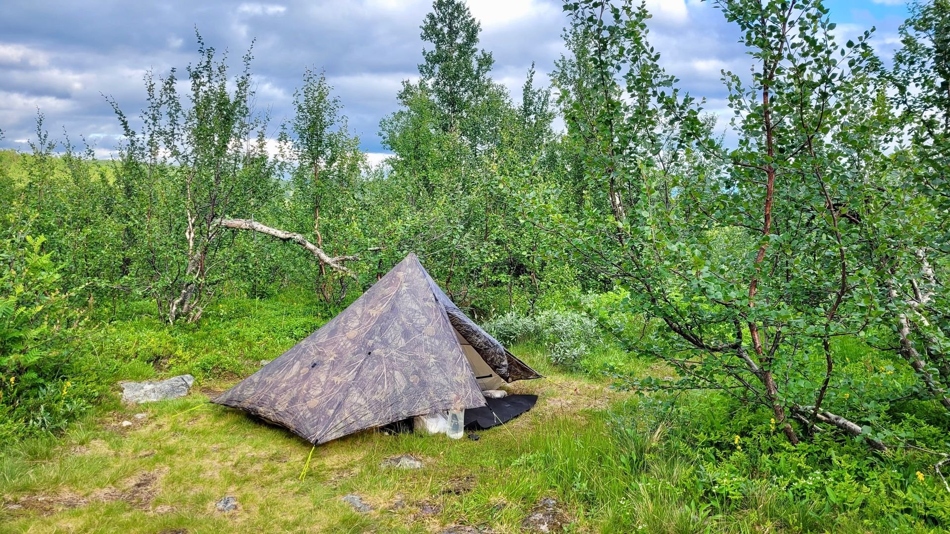 Hier finde ich an einem Seeufer eine ebene und schattige Fläche zum Zelten. Der Boden ist aber sehr nass, zum Glück hat mein Innenzelt einen DCF-Boden. Ich werfe erstmal eine Ibu gegen die Kopfschmerzen ein, die mir die Dauer-Sonne beschert hat. Nach etwas Erholung mache ich mir noch eine Tüte RealTurmat heiß und genieße den Blick auf den See, bevor ich erschöpft auf die Isomatte falle und die Mücken aussperre.