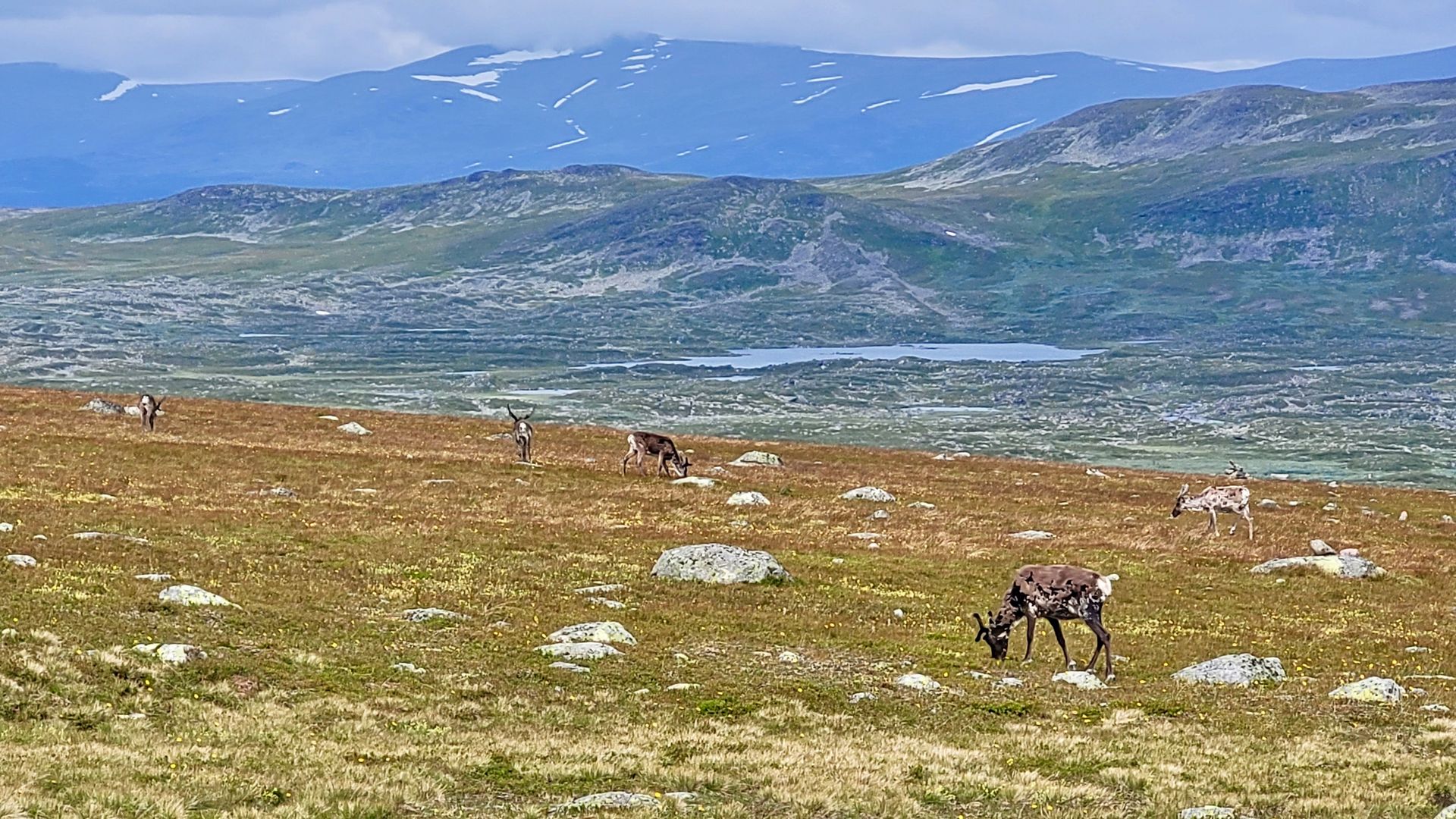 Oben erwartet mich nach einigen Kilometern das zweite Highlight des Tages: Rentiere! Bisher hatte sich nicht eines der Tiere blicken lassen, nun erspähe ich die ersten Tiere in der Ferne. Es stellt sich als kleine Gruppe heraus, die in Richtung des Trails zieht. Wir kommen uns immer näher und ich nehme etwas Tempo raus, um etwas Abstand zu wahren.