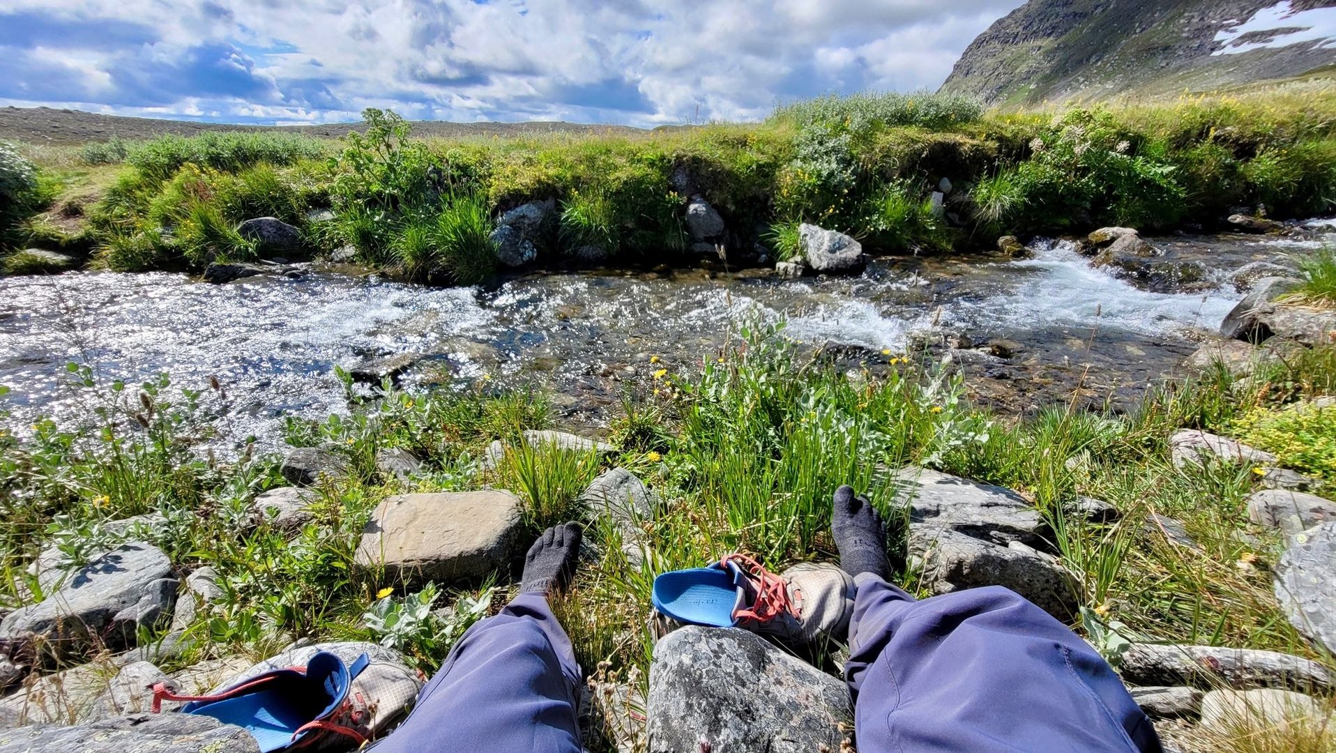 Draußen geht weiter die Welt unter und so nutze ich auch die Zeit für ein kurzes Nickerchen auf einer der Bänke. Schließlich hört der Regen wieder auf und alles machen sich wieder startklar. Im schönsten Sonnenschein geht es wieder auf den Trail. Nach kurzer Zeit ist da allerdings kein Trail mehr, sondern nur noch ein Bach. Irgendwo muss der viele Regen hin und er nimmt den gleichen Weg wie wir. Bis Jäkkvik stampfen wir immer wieder auch für längere Abschnitte durch Wasser.