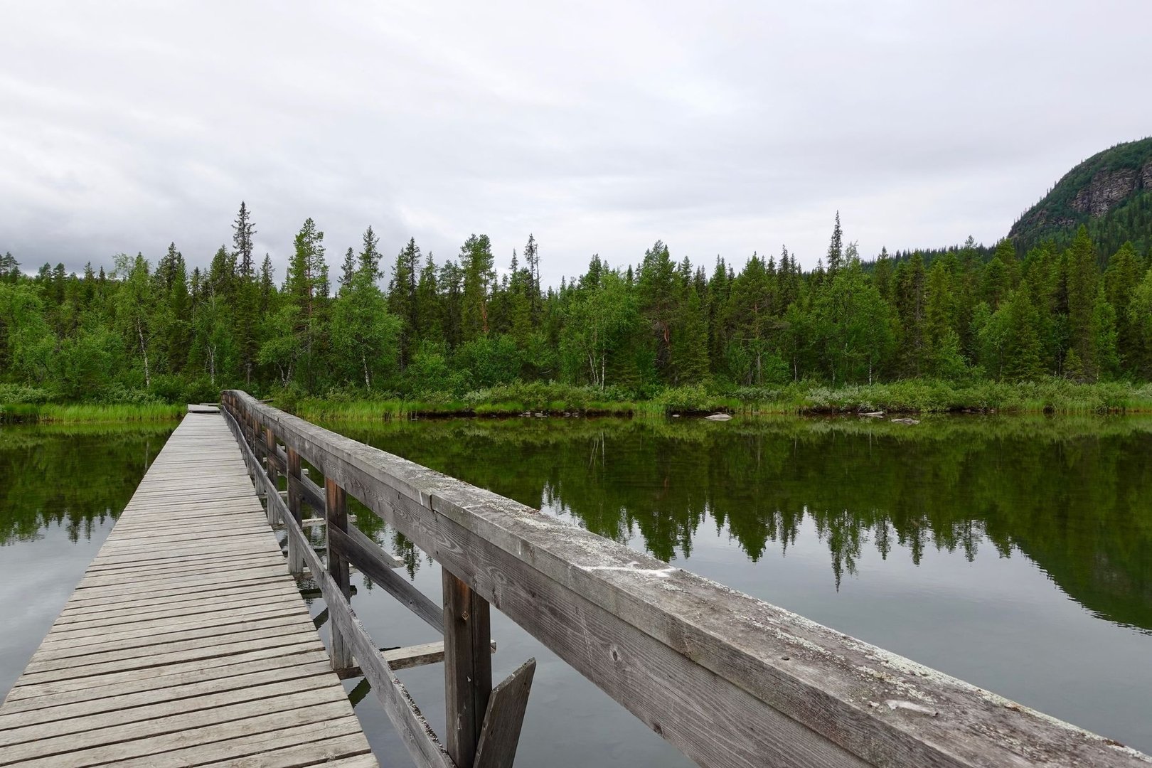 Ausgeruht und frisch gestärkt geht es weiter, es geht wieder bergab. Nach ein paar Kilometern stoße ich auf eine große Hängebrücke, die über einen großen Fluss namens Tsielejåkka führt. Dort gibt es auch eine gleichnamige Schutzhütte (Tsielejåkkastuga) und am anderen Ufer auch möglichkeiten zum Zelten. Ein paar Körner habe ich aber noch im Tank und möchte heute noch näher an den Bootsanleger kommen, um morgen nicht allzu früh aufstehen zu müssen.