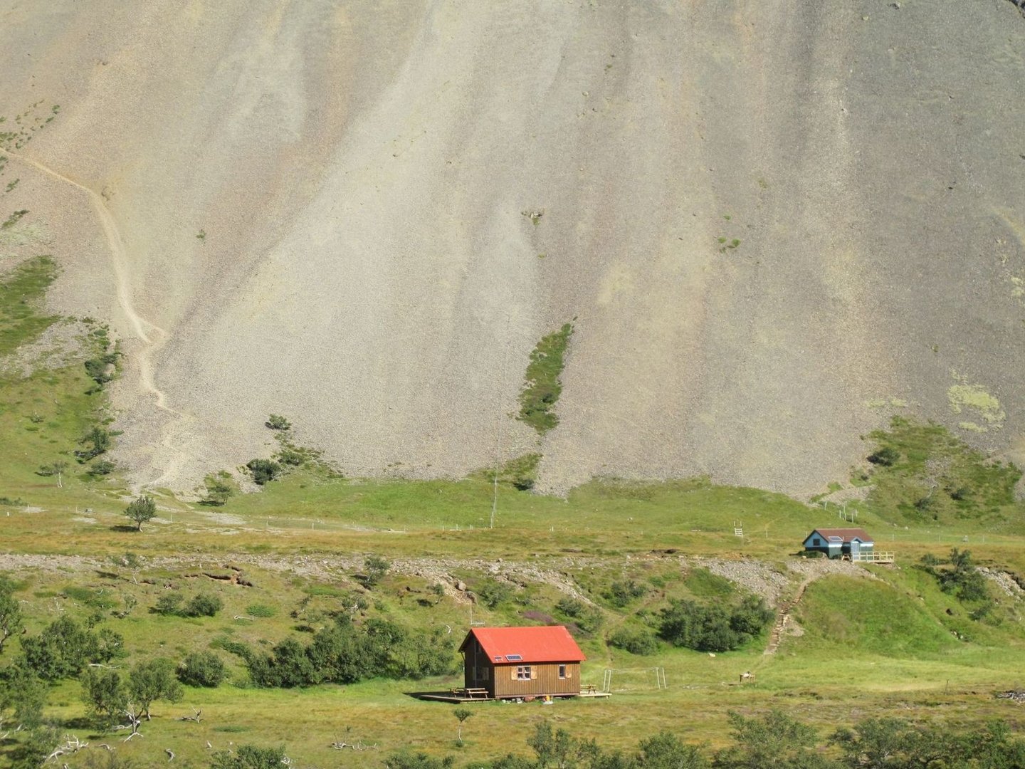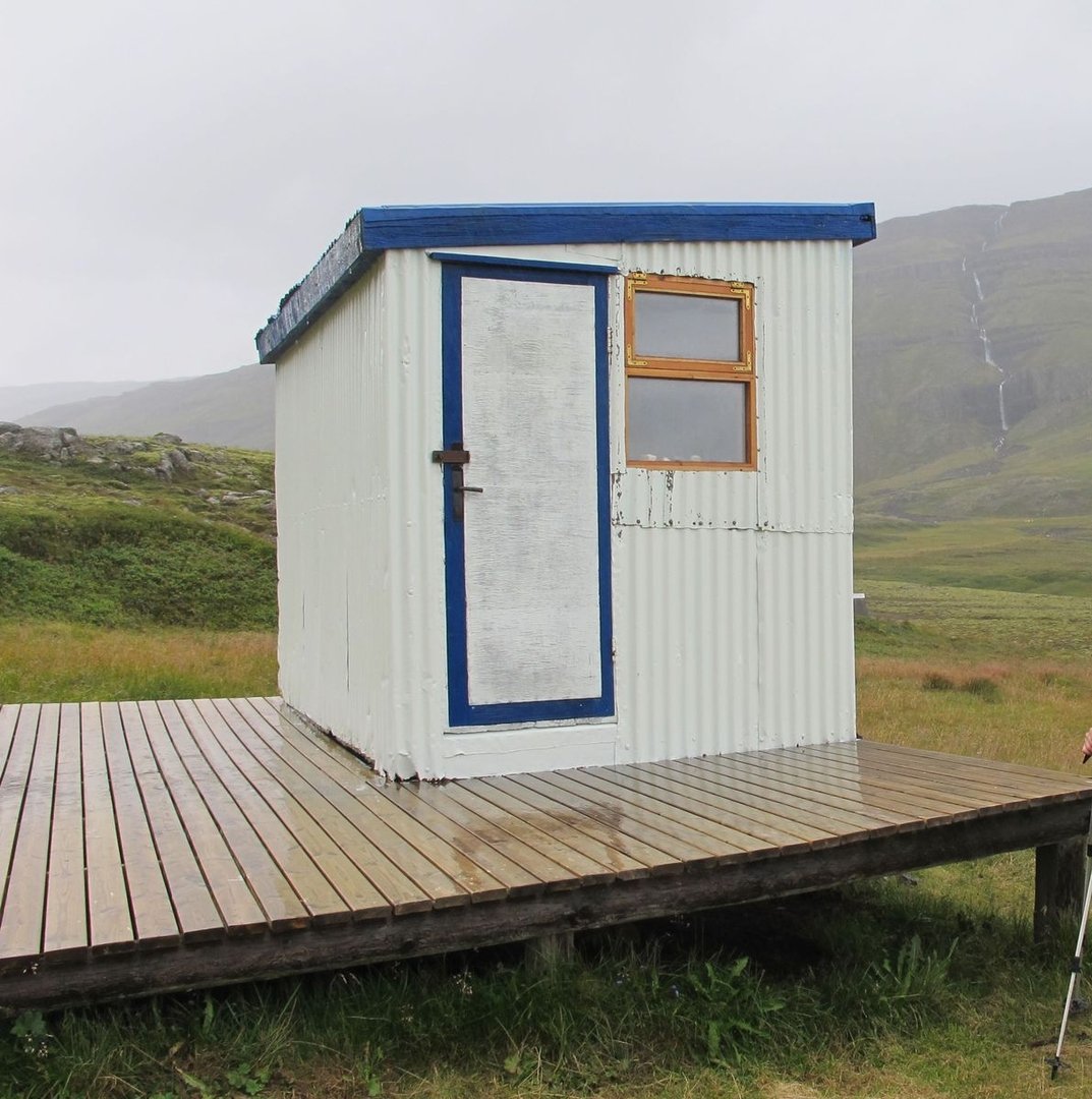 Sieht nach zumindest ein paar Fensterläden aus (Egilssel). Hatte ich nach der Tour besorgt, blättere ja gerne in so speziellen Lexika. Hütte war mit dicken Drahtseilen im Fels verankert.