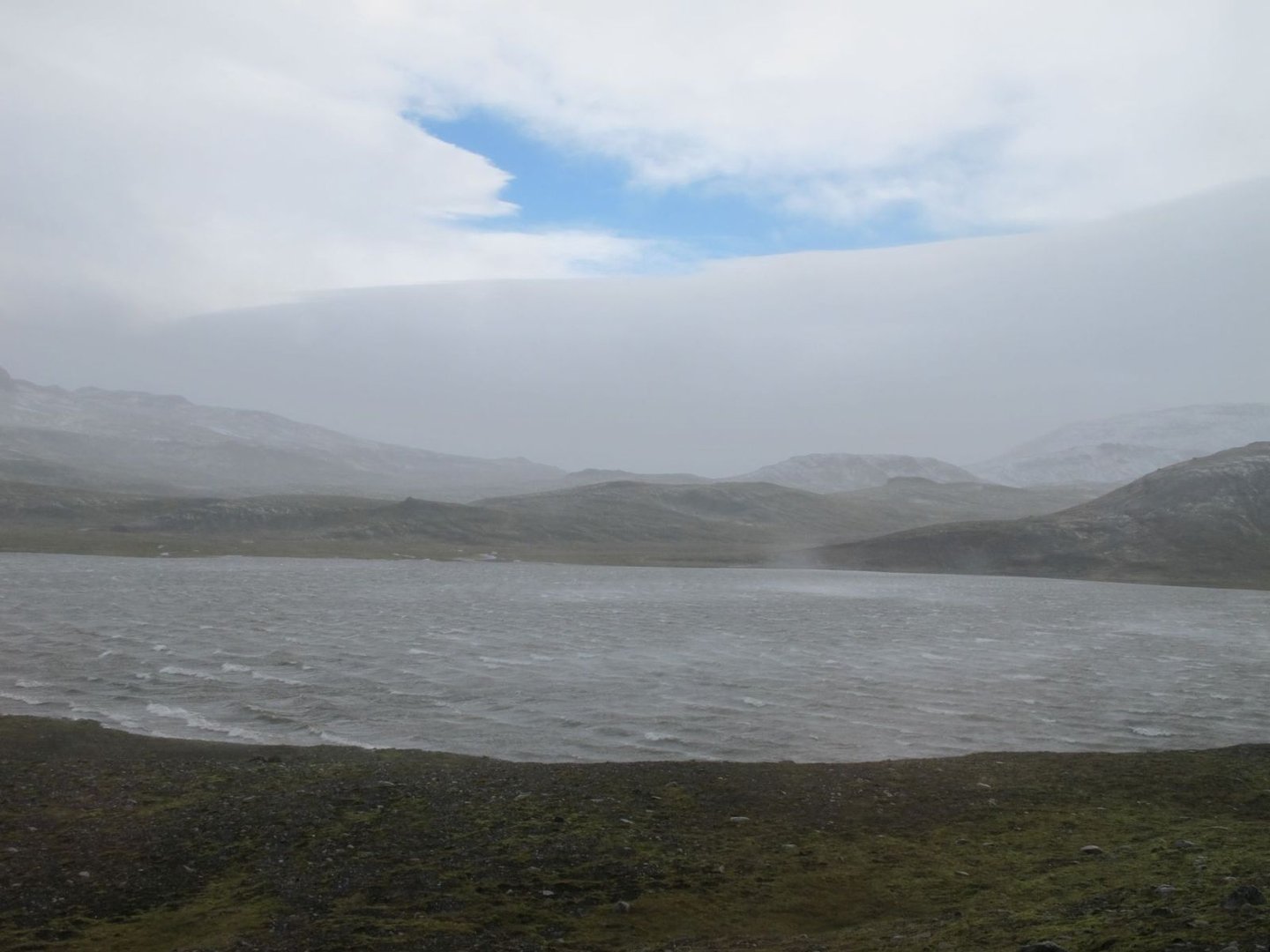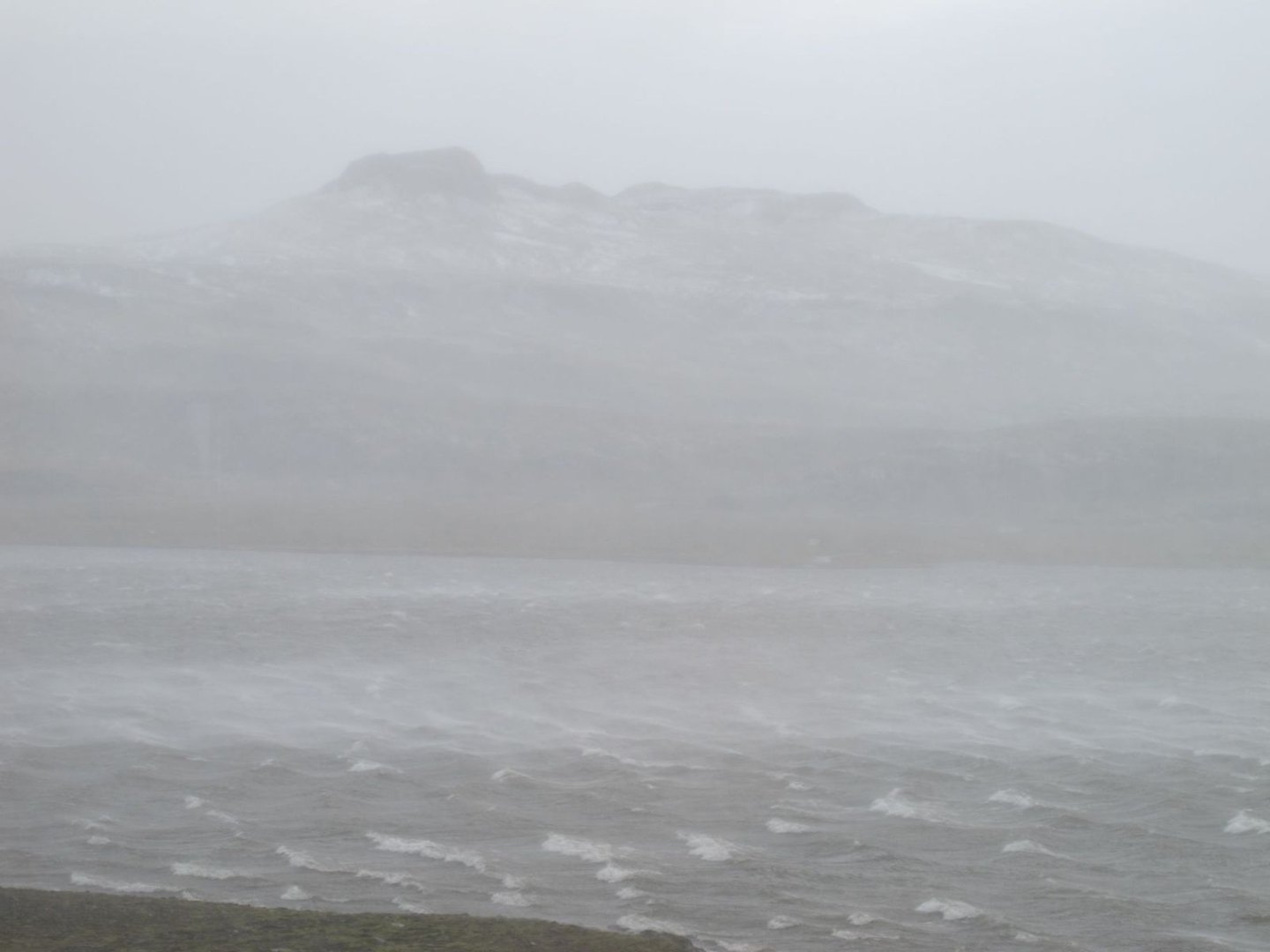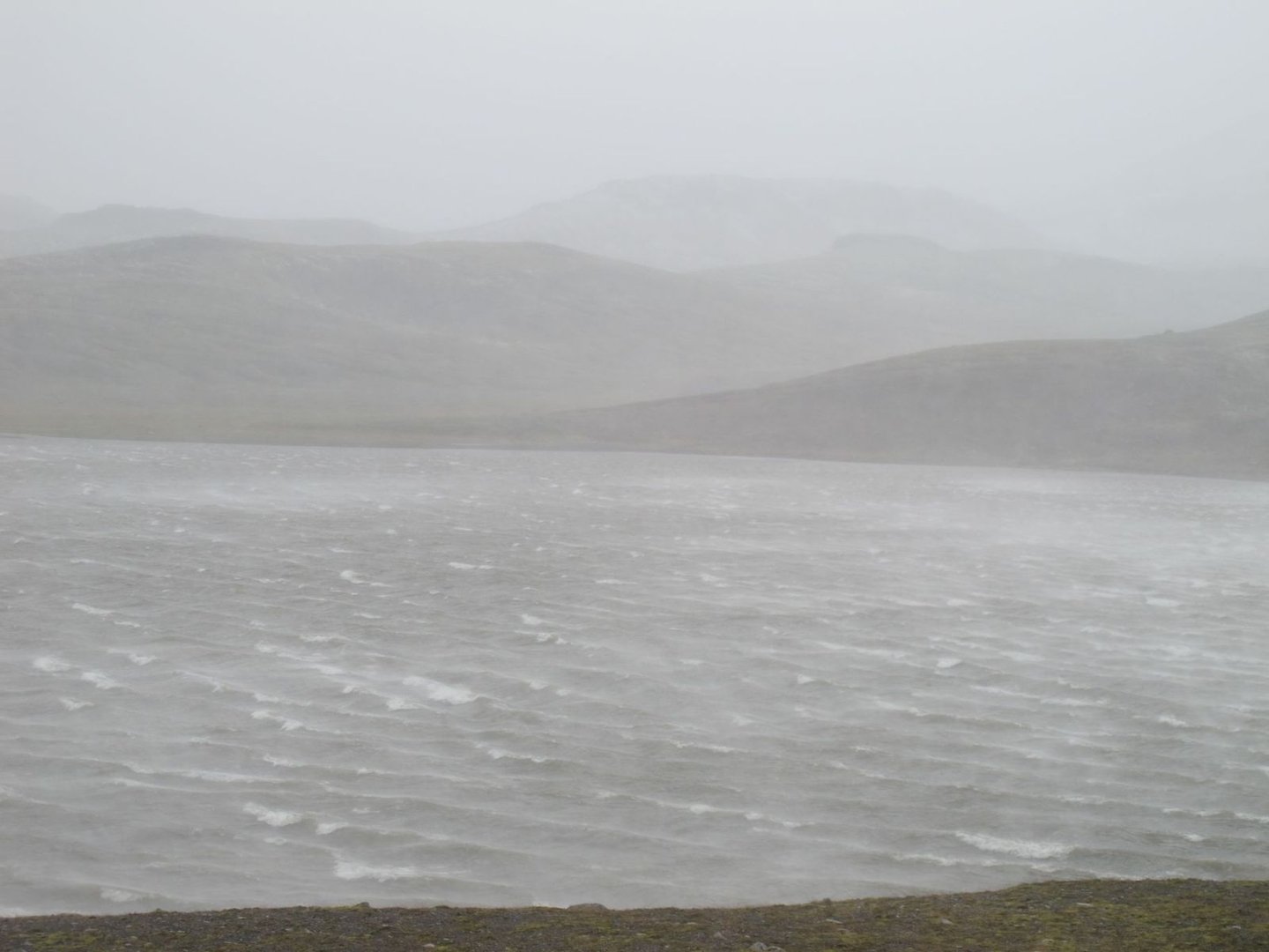 Das nächste Foto ist dann nächsten Morgen um sieben. Eisregen peitscht über den kleinen See.