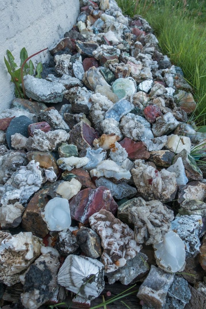 Nur ein Bruchteil der Steine, die unser Gastgeber in den Ostfjorden aus den Bergen geholt hat. Im ganzen Haus Vitrinen mit den schönsten Steinen. Draussen im Garten war nur das "Minderwertige" 8|