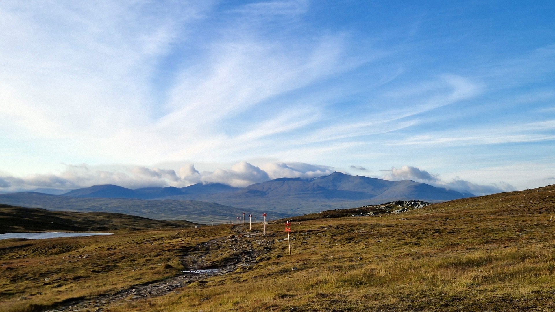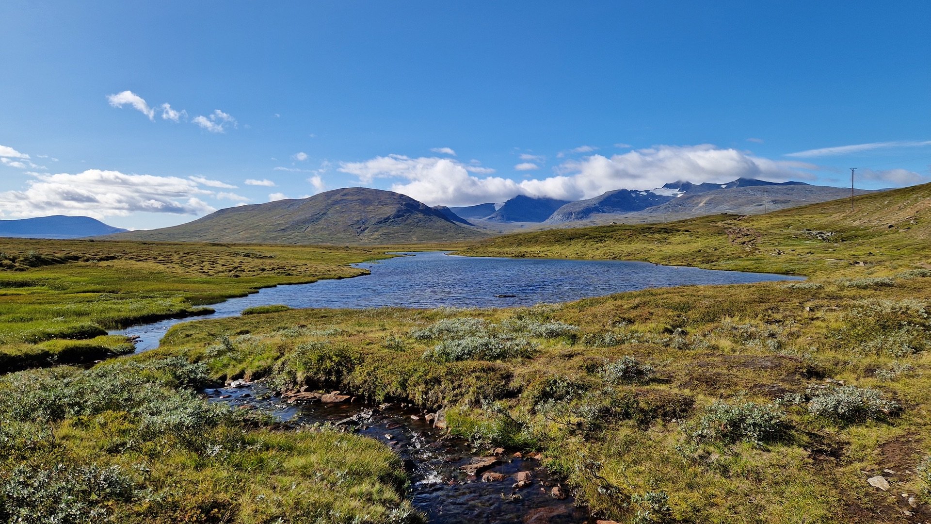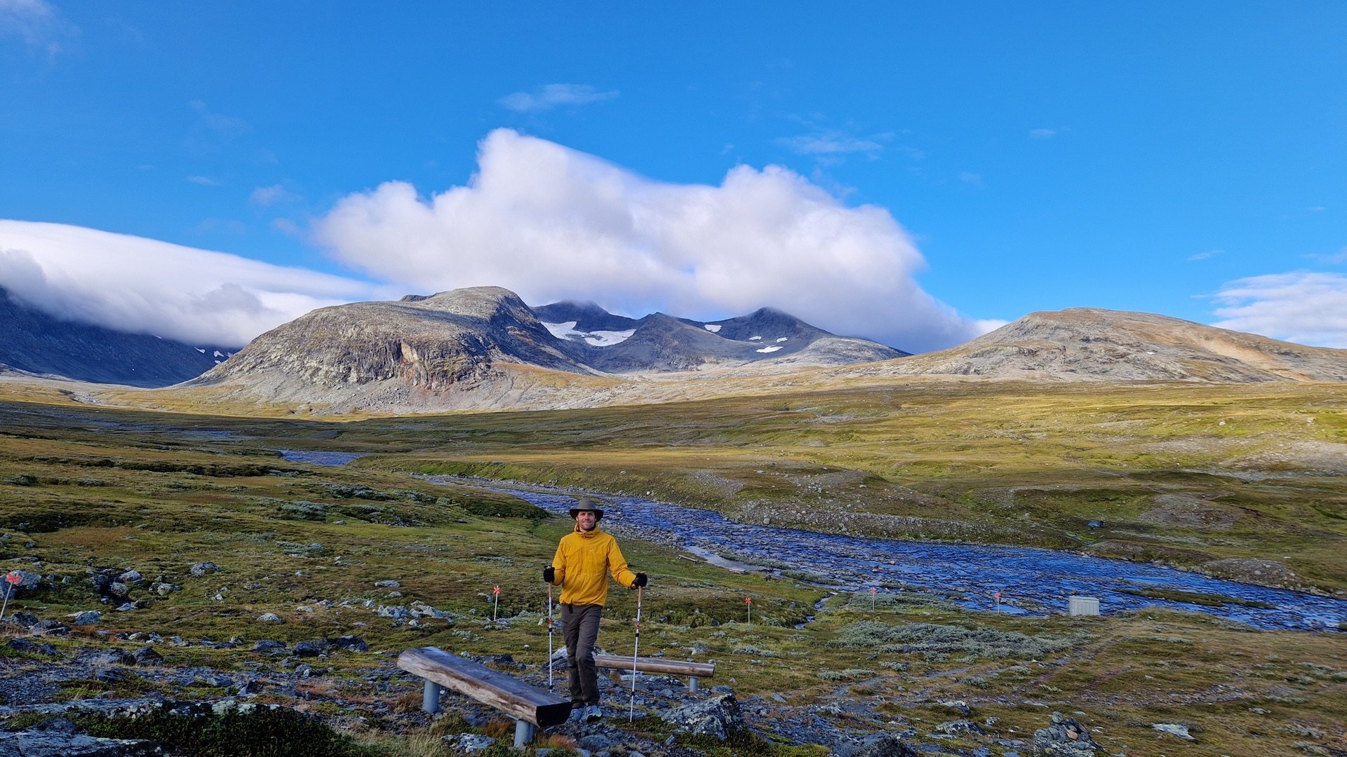 Gesagt, getan. An der nächsten Gelegenheit verlasse ich den Hauptweg und befinde mich kurze Zeit später im Quellgebiet des Enan. Schön ist es hier. Im Hintergrund kann man sowohl den Berg Helags als auch Sylarna erkennen.