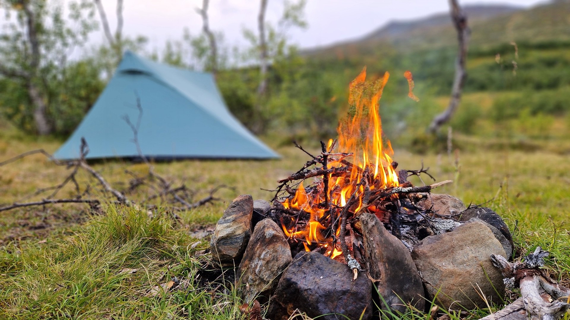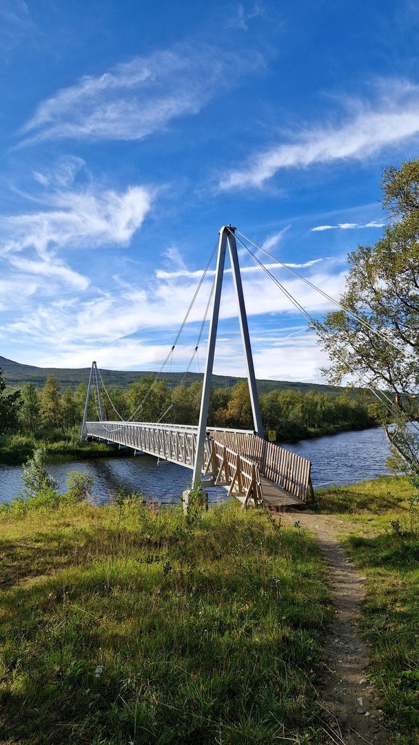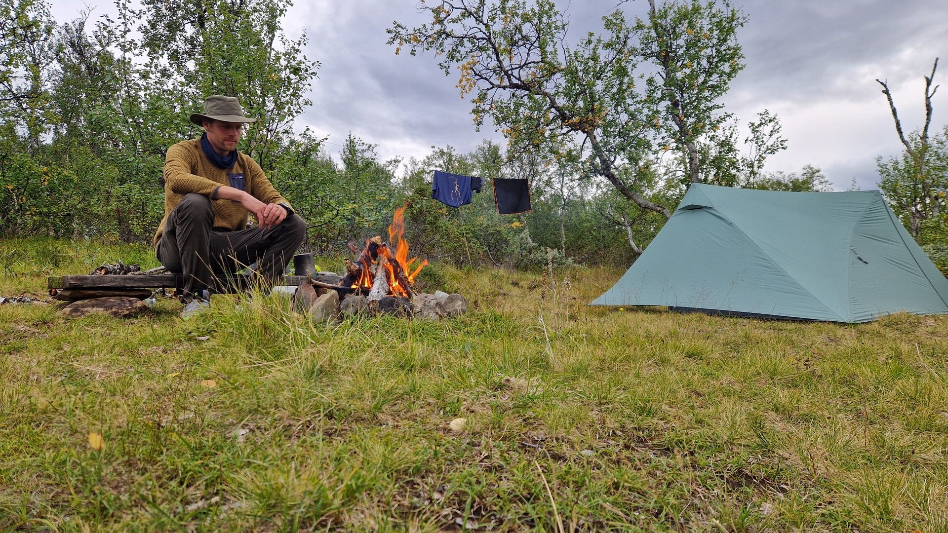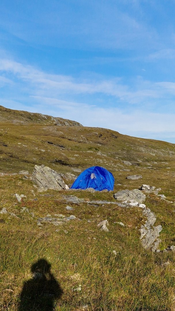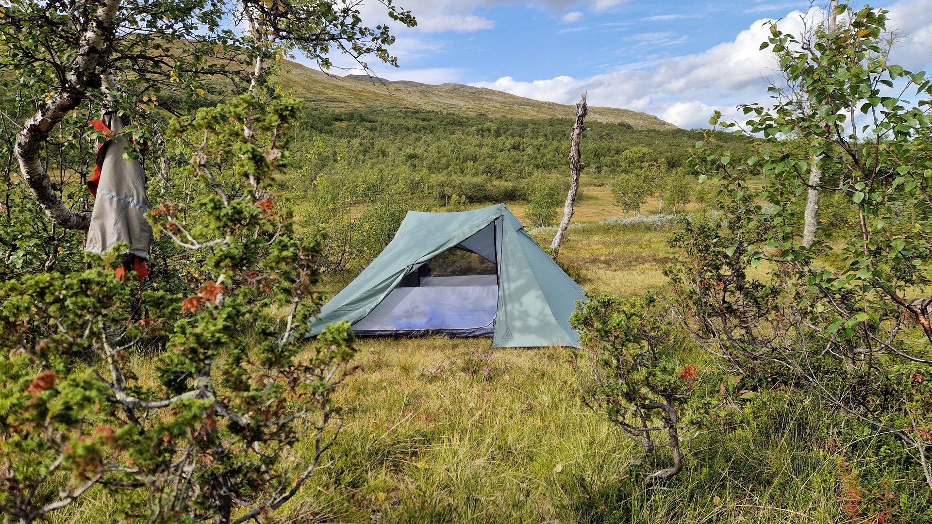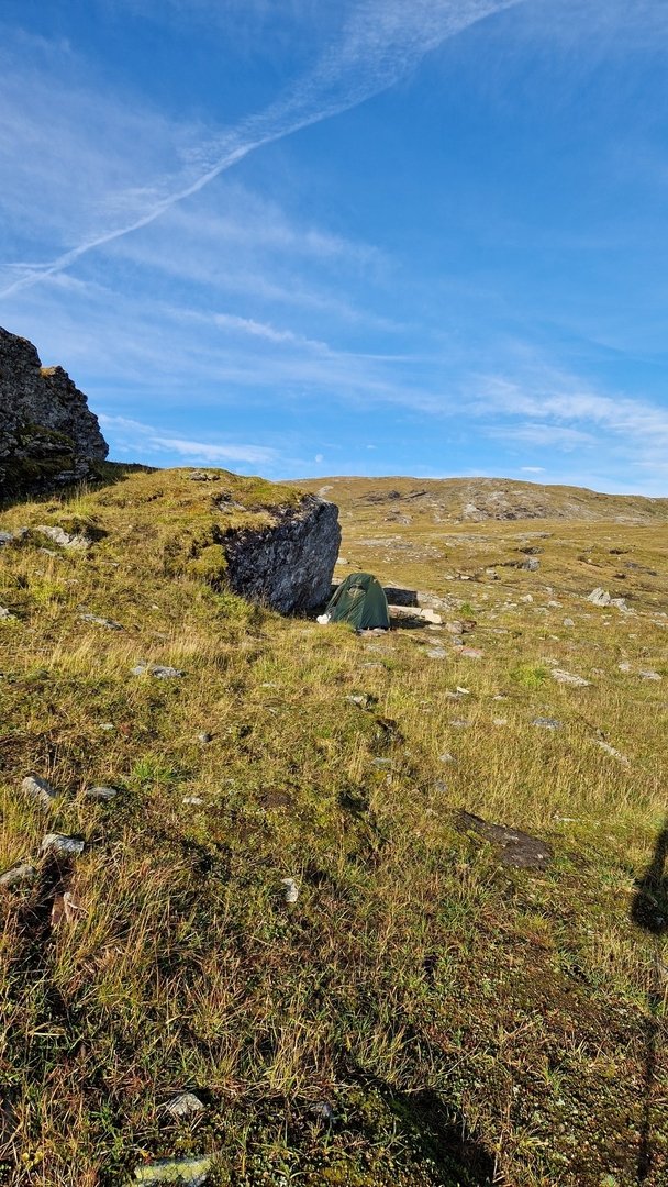 Ich mache mir ein Bild von der Umgebung und finde beim Abstieg ins Tal links des Weges eine wiesenähnliche Fläche zum Campen. Hinter mir ein schützender Hain aus Birken, auf der anderen Seite der Wiese, unweit vom Camp, der Stor-Ulvån. Der moosige Grasboden ist etwas sumpfig, aber das Groundsheet wird es schon richten.
