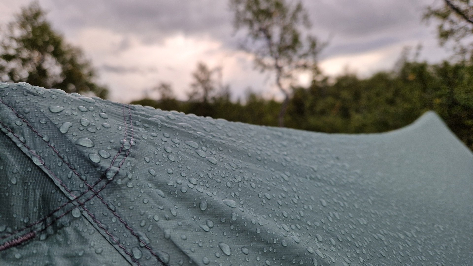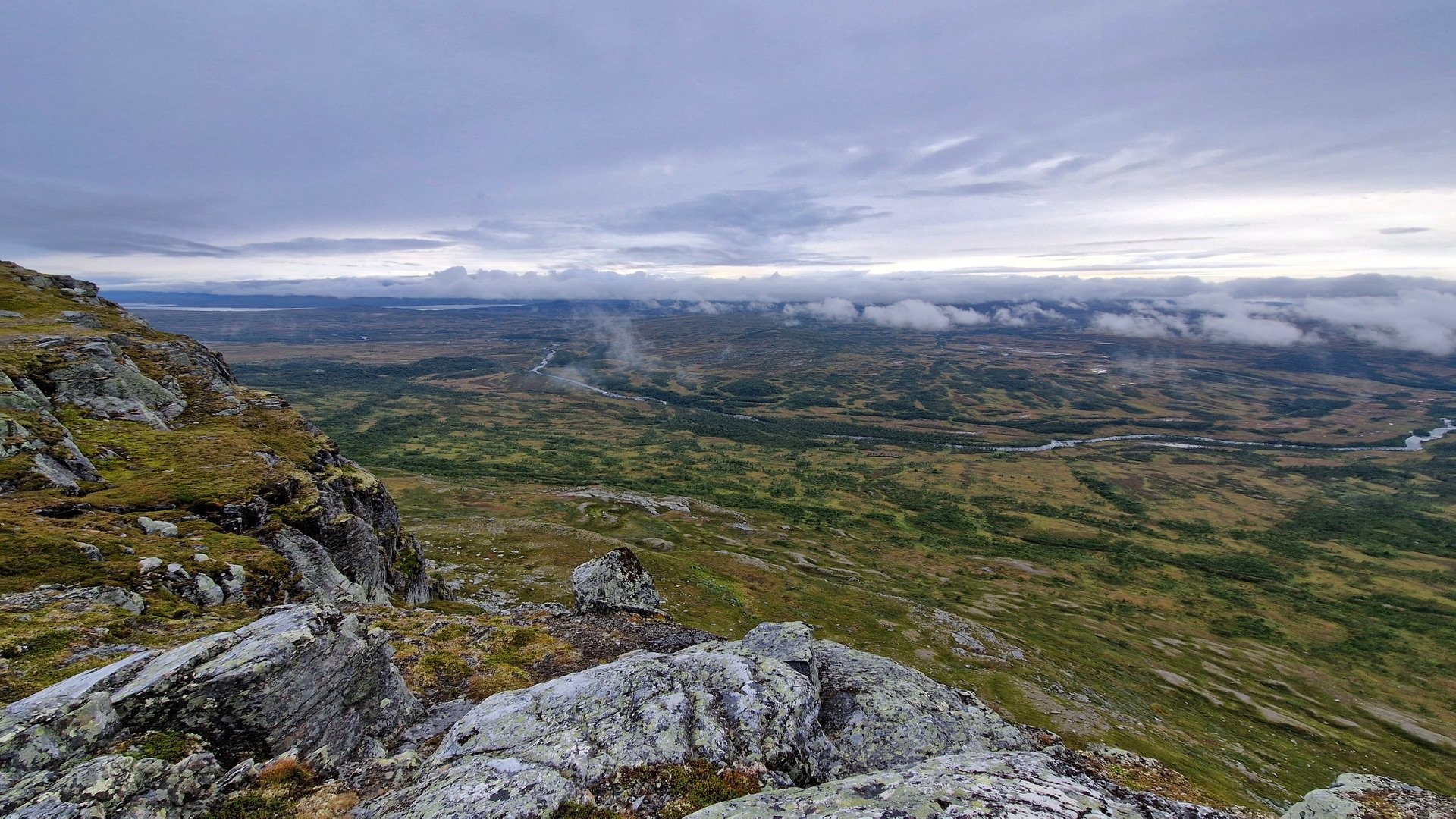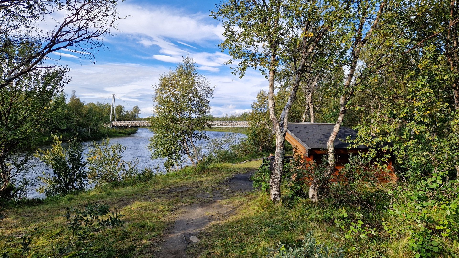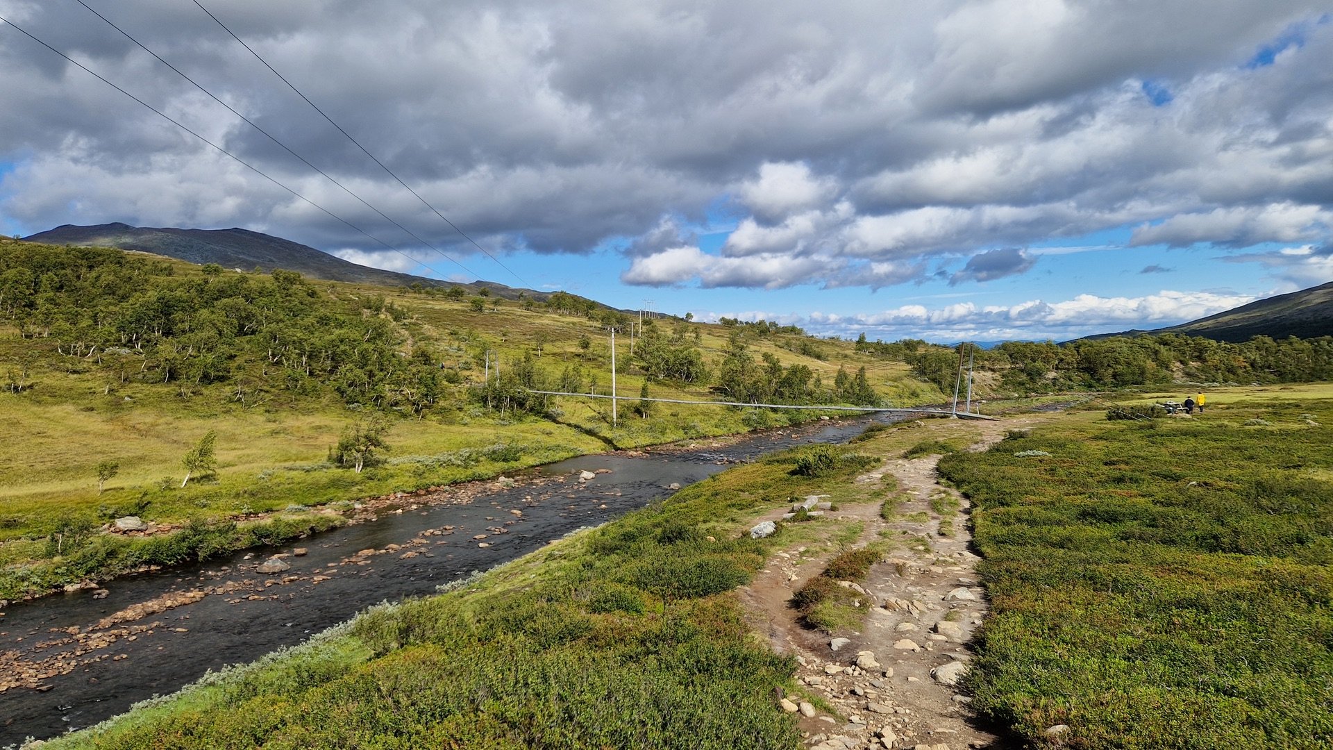 Ich mache mir ein Bild von der Umgebung und finde beim Abstieg ins Tal links des Weges eine wiesenähnliche Fläche zum Campen. Hinter mir ein schützender Hain aus Birken, auf der anderen Seite der Wiese, unweit vom Camp, der Stor-Ulvån. Der moosige Grasboden ist etwas sumpfig, aber das Groundsheet wird es schon richten.