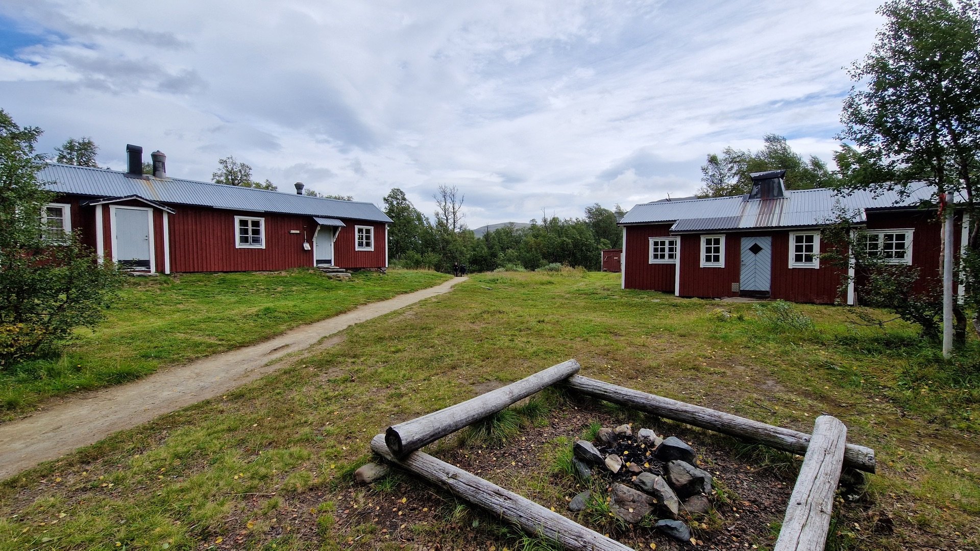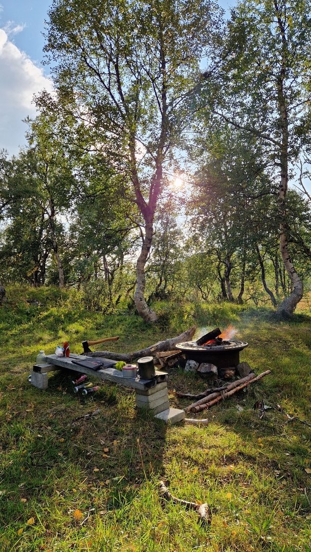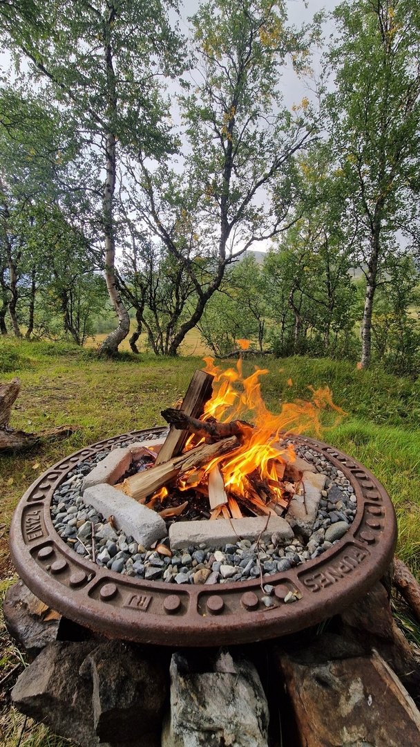 Ich richte mich ein und erledige die alltäglichen Dinge des Abends. Die alte Feuerstelle wird fit gemacht und ein kleiner Vorrat an Holz beschafft. In der Nähe der Fjällstation finde ich eine alte Wegbohle, welche mir als Sitzgelegenheit dient. Als das Feuer brennt, schreibe ich meinen Tag im Buch nieder und genieße die vielleicht letzte Nacht draußen in der wunderschönen Natur. Bei 10° Außentemperatur brauche ich mich heute um kalte Füße nicht zu sorgen.