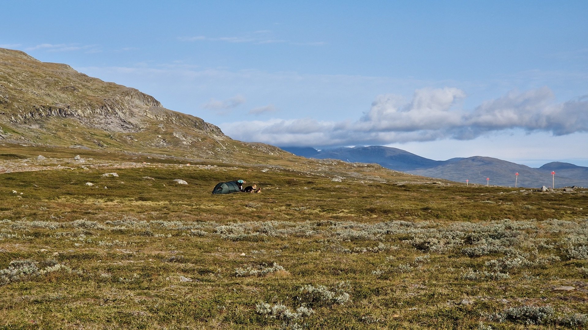 Tatsächlich kreuzt 10min später ein Bächlein den Weg und links davon führt ein kleiner Trampelpfad zum besagten Platz. Er ist wie auf einem Plateau gelegen, abgeschirmt von einem 50cm hohen Absatz, auf dem wiederum 50cm hohe Blaubeerbüsche wachsen. Der Wind kommt aus Südwest, abgeschwächt vom nördlichen Ausläufer des Helags. Der Rest der hier noch ankommt, wird von den Büschen abgehalten. Dieser Platz ist hier draußen tatsächlich ein Glücksgriff und ich bin sofort überzeugt.