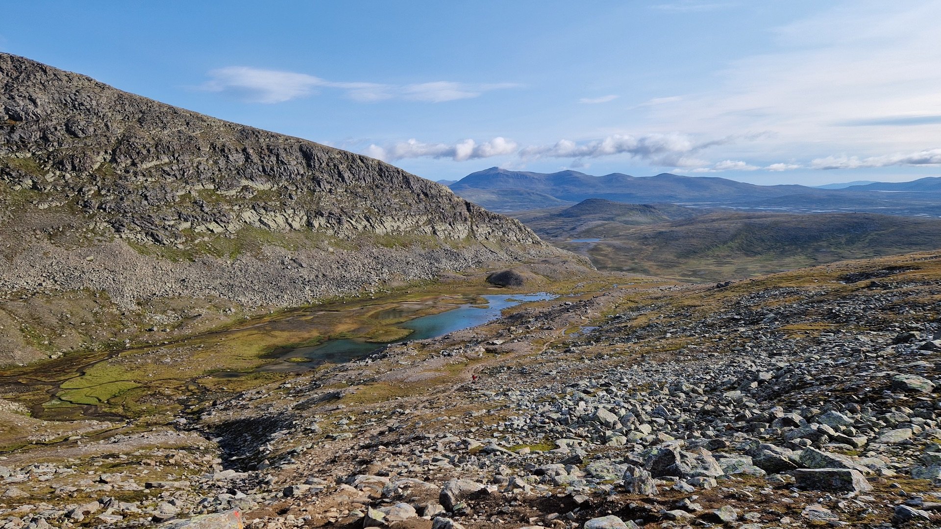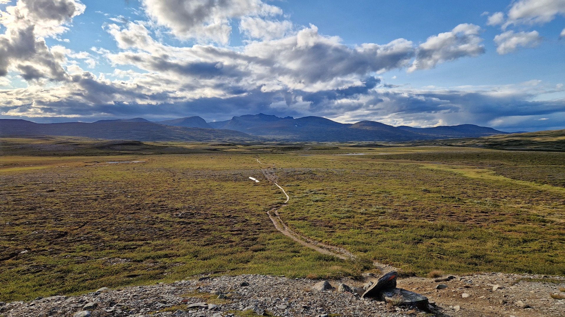 Gegen 09:00h verabschiede ich mich von den drei Trailrunnern mit einem Lächeln und dem Hinweis, dass ich später in der Sauna auf sie warten werde. Es geht 13km ziemlich gerade aus, mit einer kleinen aber langezogenen Steigung am Fuße des Helags. Als ich mich nach ein paar Hundert Metern noch mal umdrehe ist die Stuga bereits nur noch ein kleiner Punkt auf dem Berg.