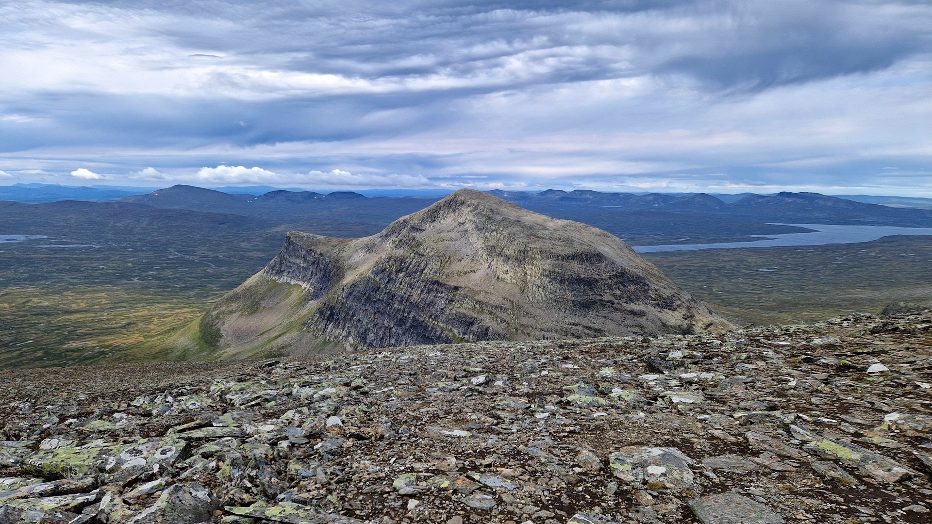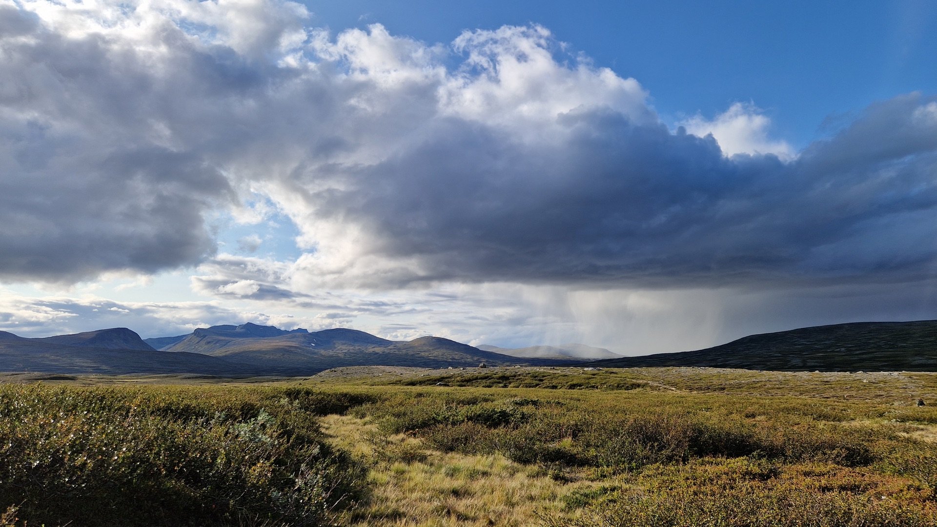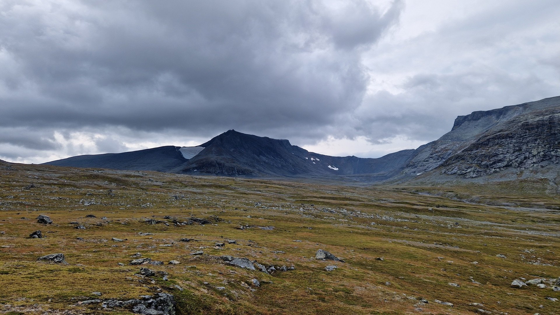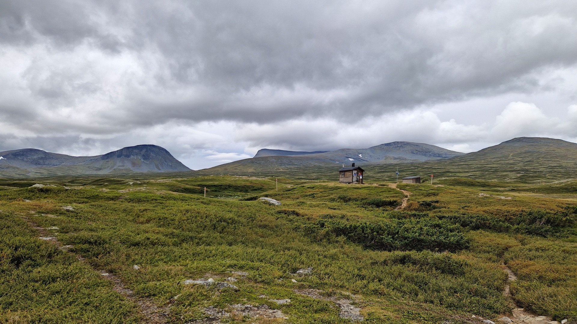 Klar, das Sylarna Massiv liegt immer gut sichtbar voraus, allerdings hatte ich mir das gestern schon gefühlte 5h angesehen und die äußeren Umstände machten es nicht interessanter. Heute kommen mir dafür schon ein paar mehr Leute entgegen und in der Rasthütte Miesehketjahke sitzen wir nach kurzer Zeit zu viert und machen Pause.