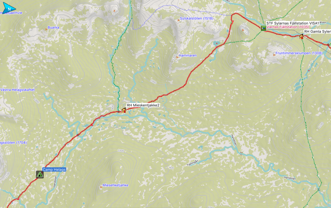 Es geht weiter auf dem Weg Richtung Sylarna. Bis zur Sylarna Fjällstation sind es gute 20km. Das Ganze heute noch am Stück ist natürlich abwegig, aber irgendwo vor der Misehketjahke Schutzhütte soll der Fluss Handölan bis nah an den Weg reichen. Vielleicht findet sich ja dort in der Nähe ein Fleckchen, irgendwo im Flussbett oder einer Senke.