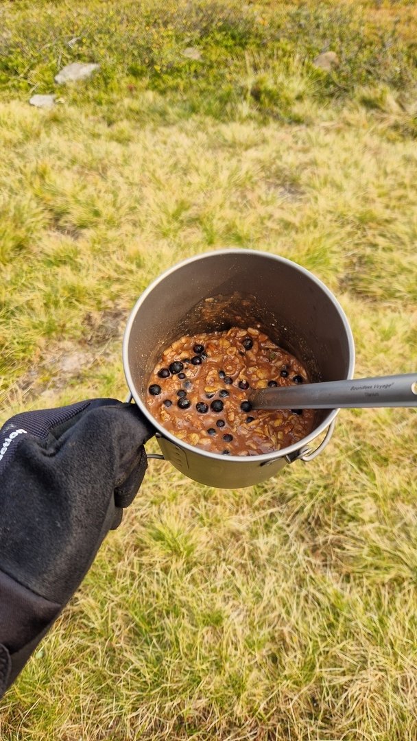 Ich steige langsam weiter ab und nach 3:50h bin ich wieder an der Fjällstation angekommen. Pünktlich zum Mittag. In der Gemeinschaftsküche bereite ich mir Porridge und Kaffee, dazu noch einen dicken Schokoball von der Rezeption.