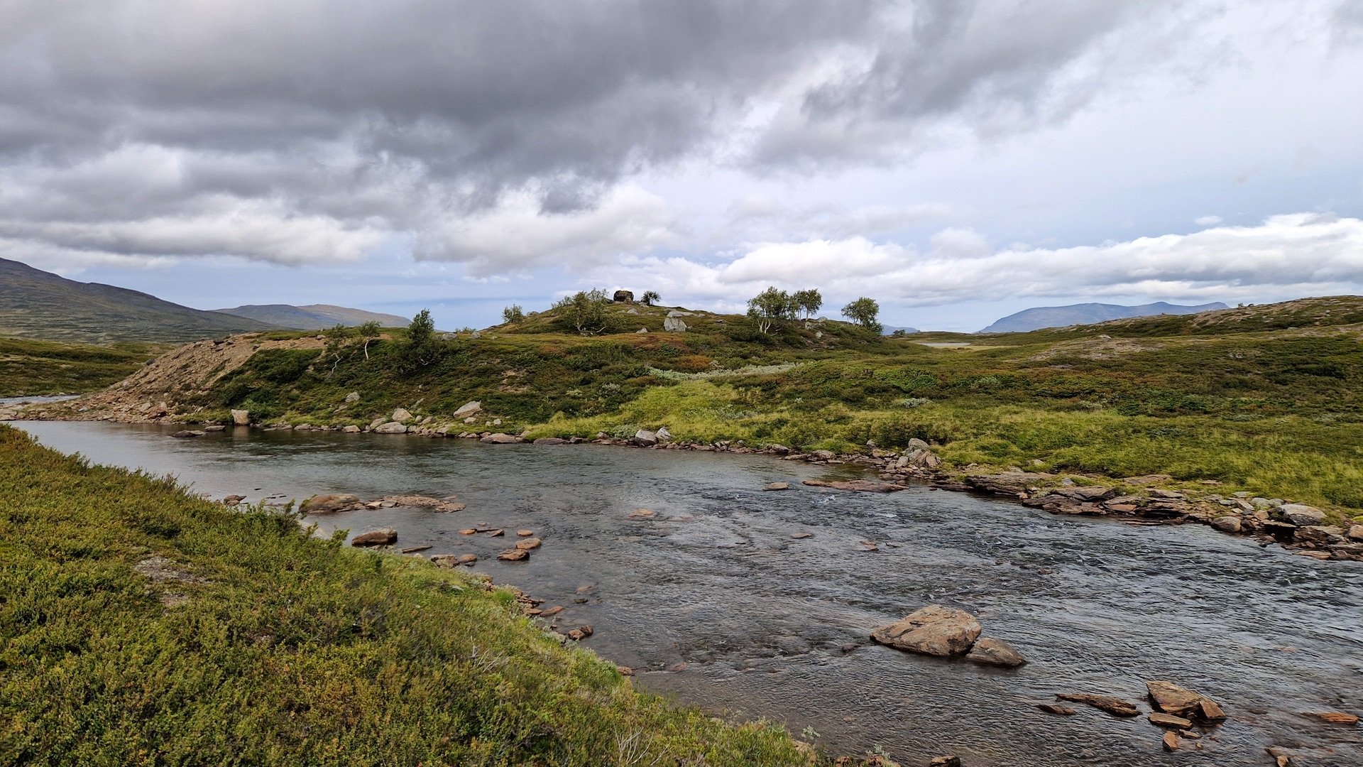 Beim Blick auf die Karte überlege ich links abzubiegen, Richtung Ekorrdörren und dann über den Templet zur Fjällstation zu gelangen. In der Realität kann ich mit Blick von der Hütte aus allerdings nur Sumpfland und kleinere Seen ausmachen. Es ist wohl eher ein Winterweg und irgendwie fehlt mir heute auch die Lust, weiter danach zu suchen. Nach ein paar Snacks und etwas Klönschnack gehe ich weiter. Der Handölan hat hier über viele viele Jahre eine Landschaft aus Altarmen, Abbrüchen und kleinen Seen geschaffen.