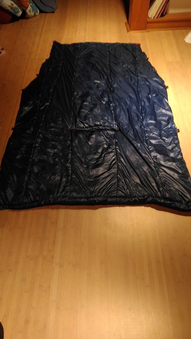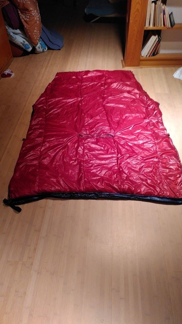 Um etwas Gewicht zu sparen, habe ich nur eine Lage PLG über die gesamte Breite an das Innenfutter genietet, an die Außenhaut kam nur eine, die über die gesamte Länge so breit wie die Fußbox ist. Da ich den Quilt hauptsächlich in der Hängematte und vermutlich immer nur als zweite Schicht über dem Daunenschlafsack nutzen werde, sollte das so passen. Gewicht: 597g, also minimal schwerer als der Apexquilt (dürfte an etwas schwereren Schnallen und Gummis liegen), das Packmaß liegt etwa 1/3 unter dem Apexquilt. Bin sehr gespannt, was er an Wärmeleistung bringt und werde das natürlich hier berichten.