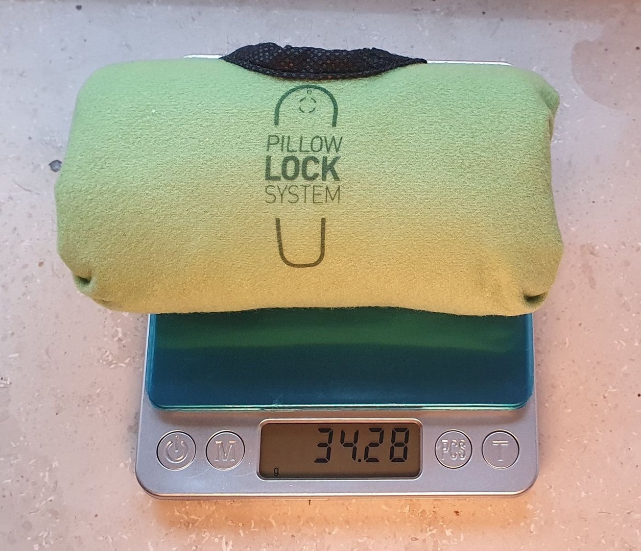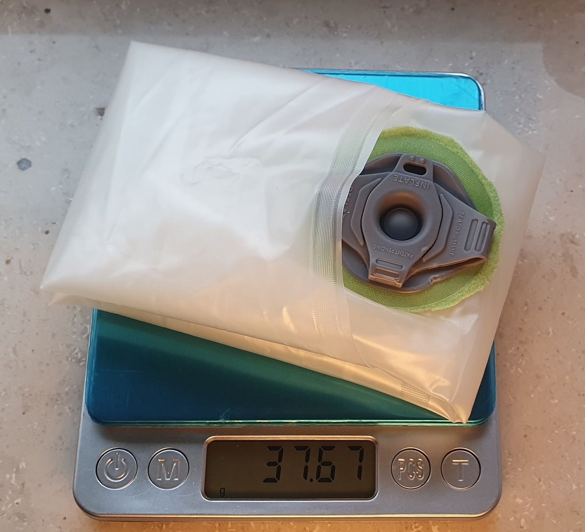 Das Kissen wiegt brutto 77 g und nach ein paar Schnitten und Stichen nun noch knapp halb so viel: 38 g.