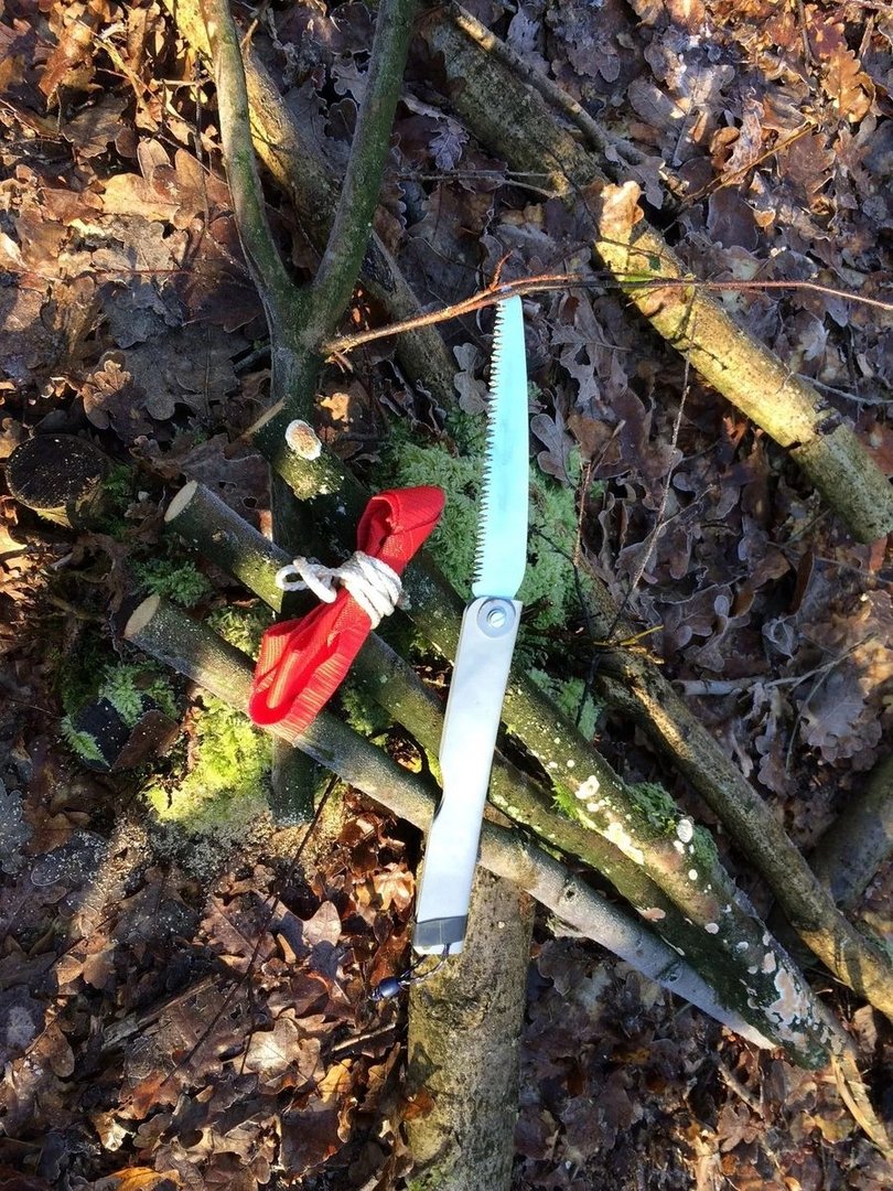 Natürlich reicht da die Säge am Victorinox! Es ist halt ein Dreieck, genàht aus dem Kofferfurt, mit "Stabtaschen" und ein Stück Band. Wiegt 43 g.