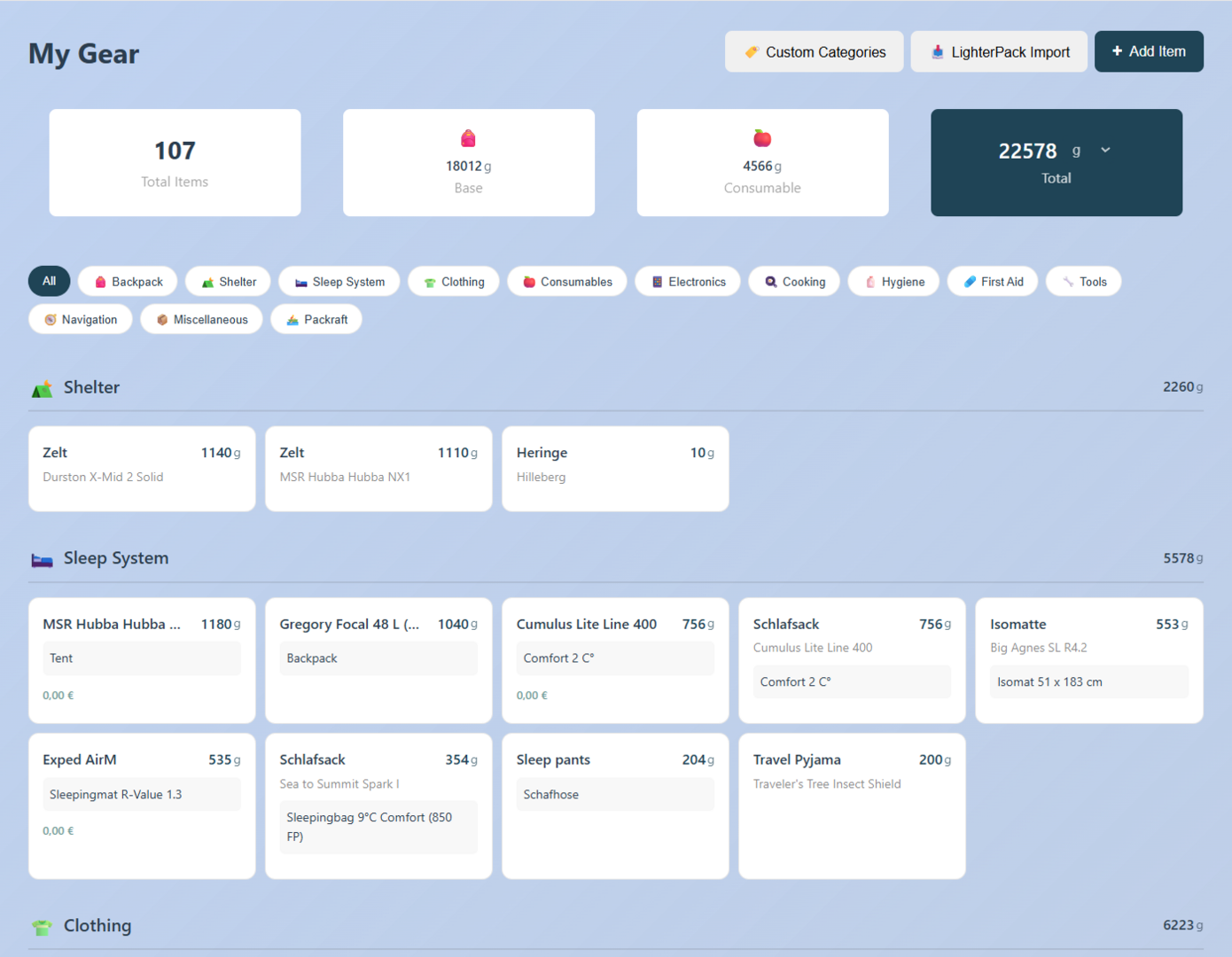Gleichzeitig habe ich mein Equipment für die Tour bisher mit LighterPack erfasst.