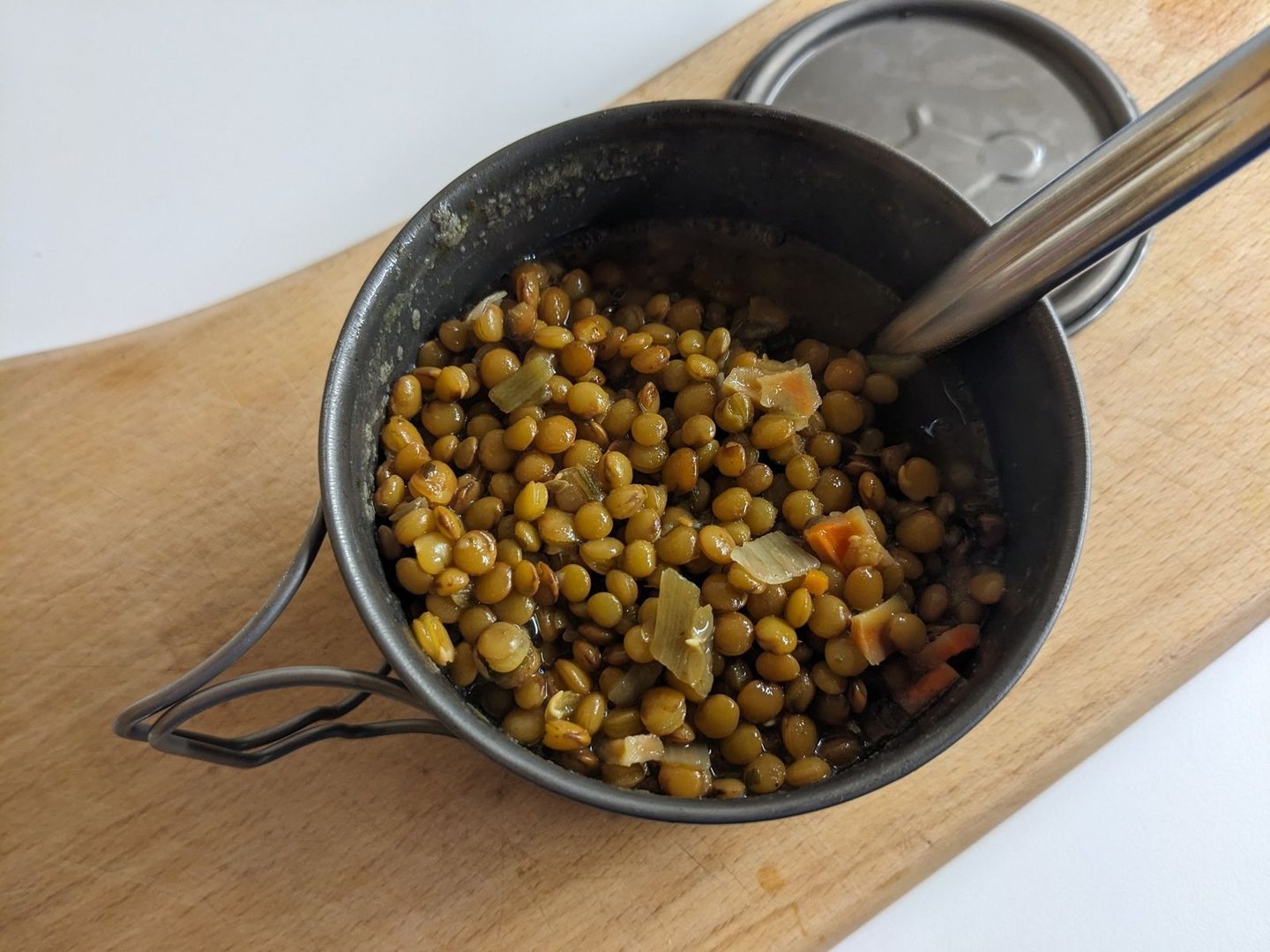 Was vor allem auf fällt, ist, dass ein Toaks 550 Topf viel zu klein für die Art zu kochen ist. Für die Linsen passt es gerade so, aber hätte ich noch die Würste, und ggf auch etwas Reis dazu, wäre ich sicher bei 750ml++ gelandet .