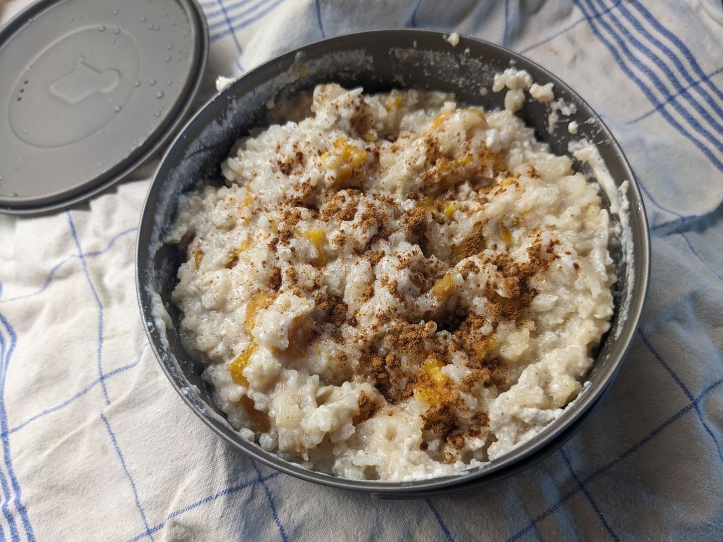 Kokospulver ins Wasser rühren, mit Reis zum kochen bringen, restliche Zutaten (bis auf den Zimt) dazu. Köcheln bis Flamme aus. 30min in den Schlafsackkocher. Umrühren. Zimt drauf. Krass lecker!