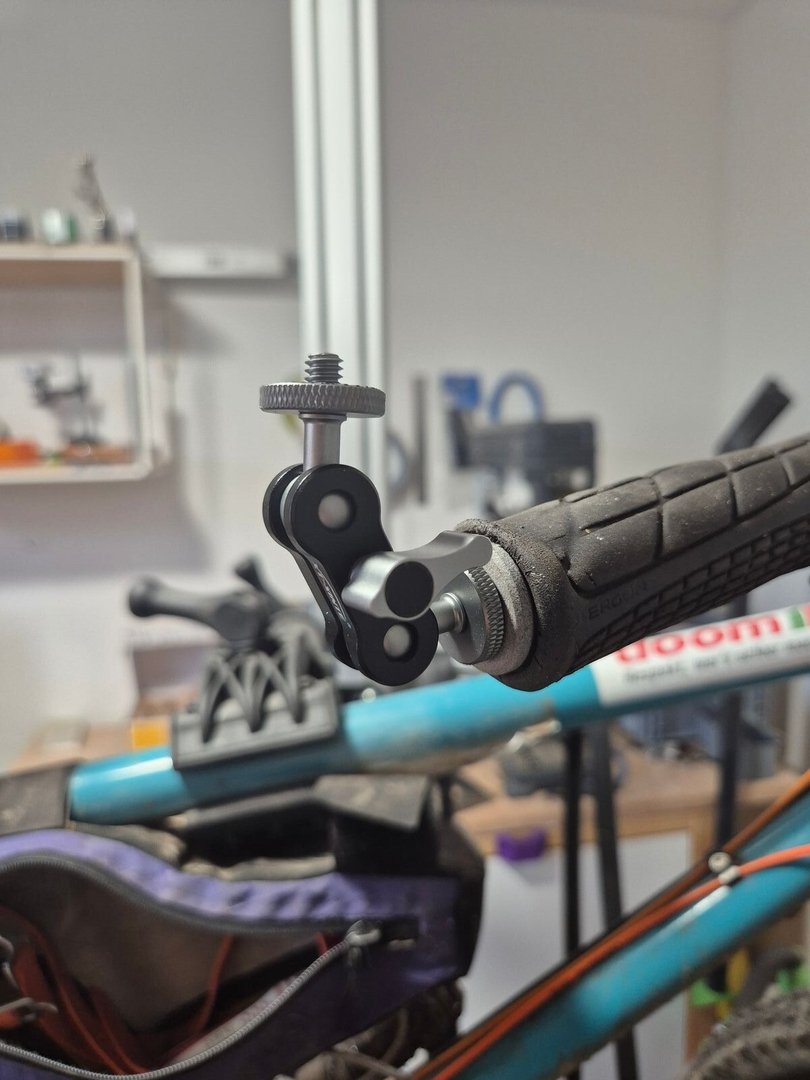 ), würde ich so vorgehen: Gewindeeinsatz in den Griff einlassen, Magic Arm darauf, und darauf den Joby-Halter.Am Fahrrad sieht das ungefähr so aus: