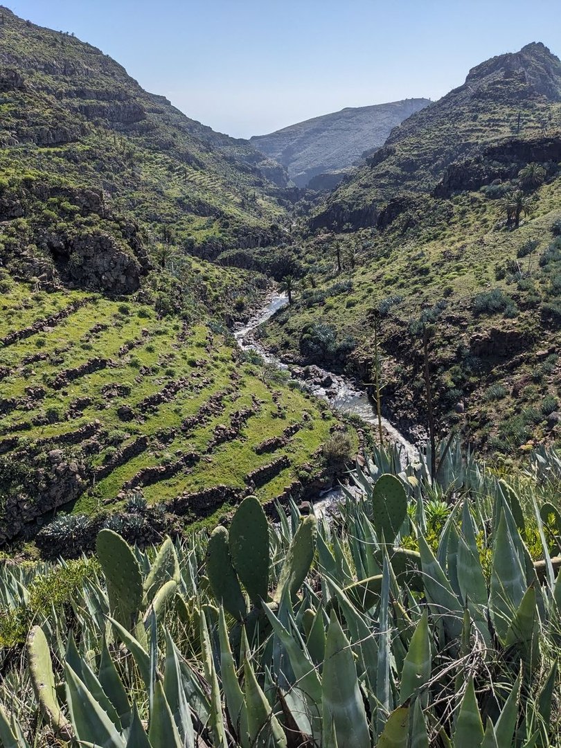 Es fühlt sich an wie die Anreise von Lara Croft zu ihren Abenteuern. Oder sowas wie “der Schatz im Silbersee”. Man ist optisch und mental ganz weit weg von allem und staunt über die Szenerie. Wasserfälle. Verfallene Bauernhöfe mit uralten Bewässerungssystemen. Und Terrassen voll Getreideähren, die sich schwindelerregend die steilen Hänge hochziehen. Palmen. Kakteen. Es erinnert an die romantische Idee des “guten, alten, einfachen Lebens”, falls es so etwas je gab: Frisches, selbstgebackenes Brot. Etwas Ziegenkäse, ein Schluck Wein. Und feuchte Küsse sündiger Liebe im duftendem Heu, gepaart mit dem Geschmack salziger Haut.