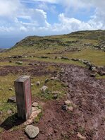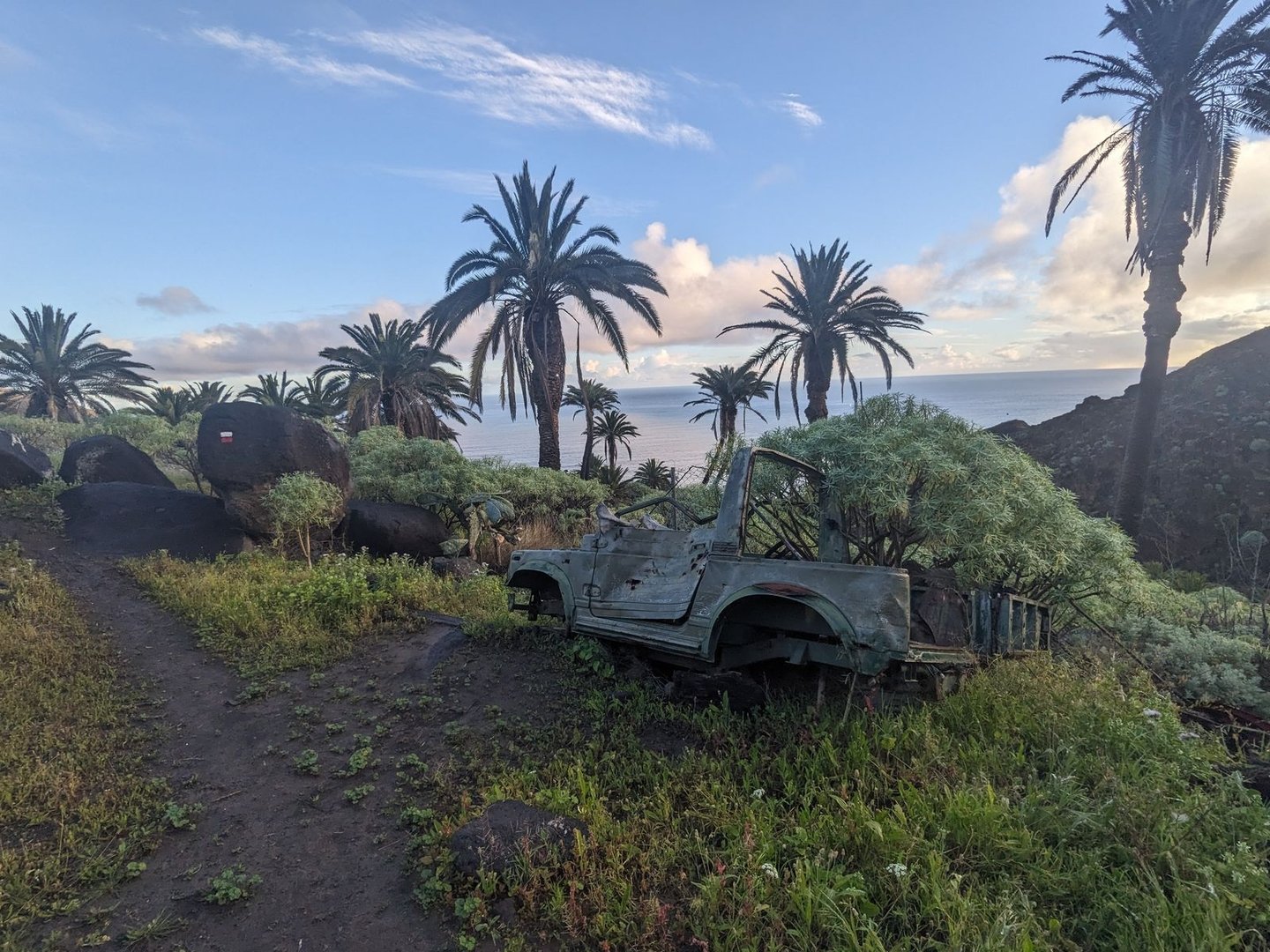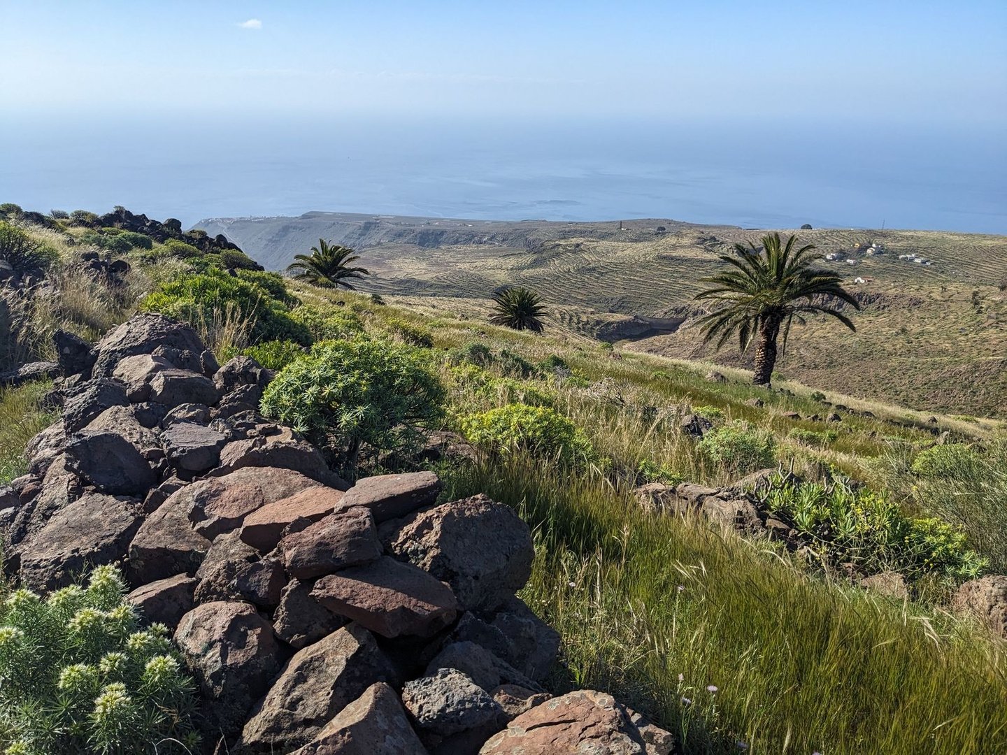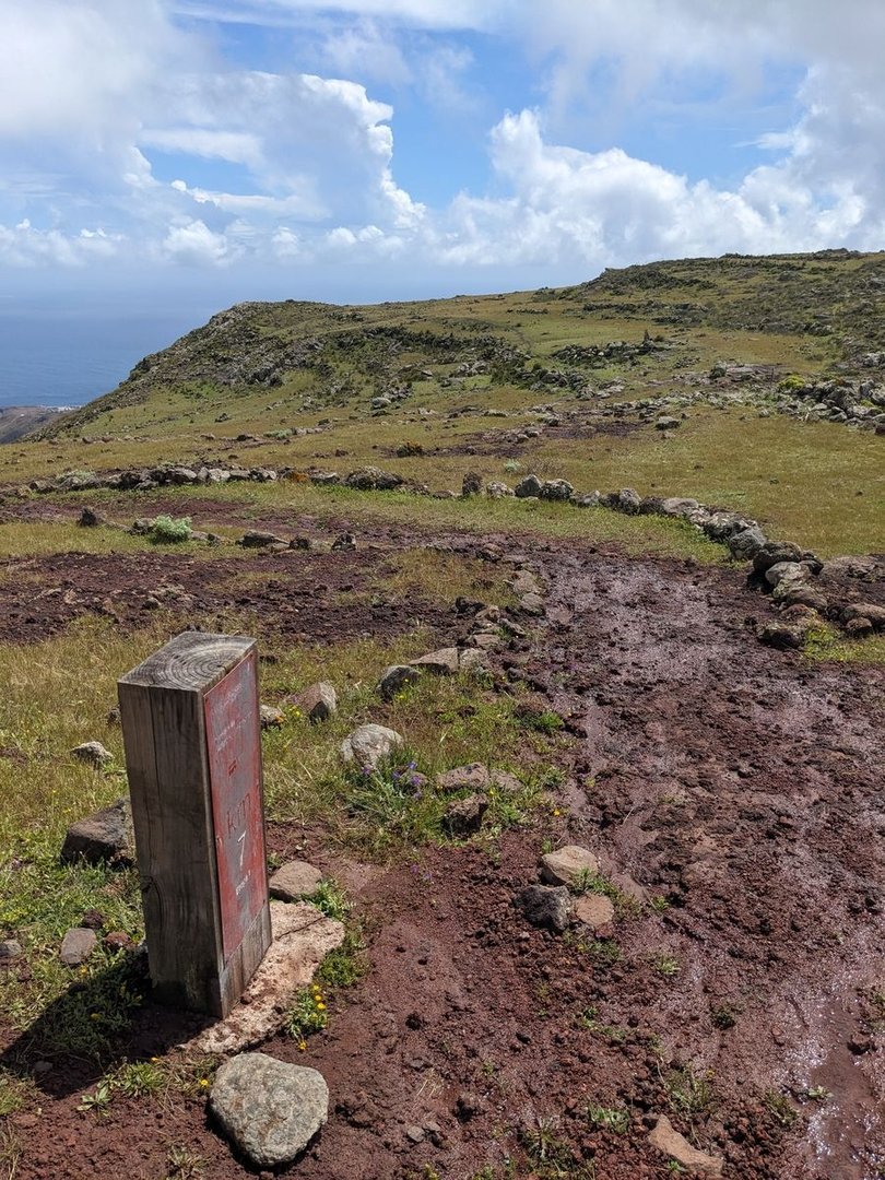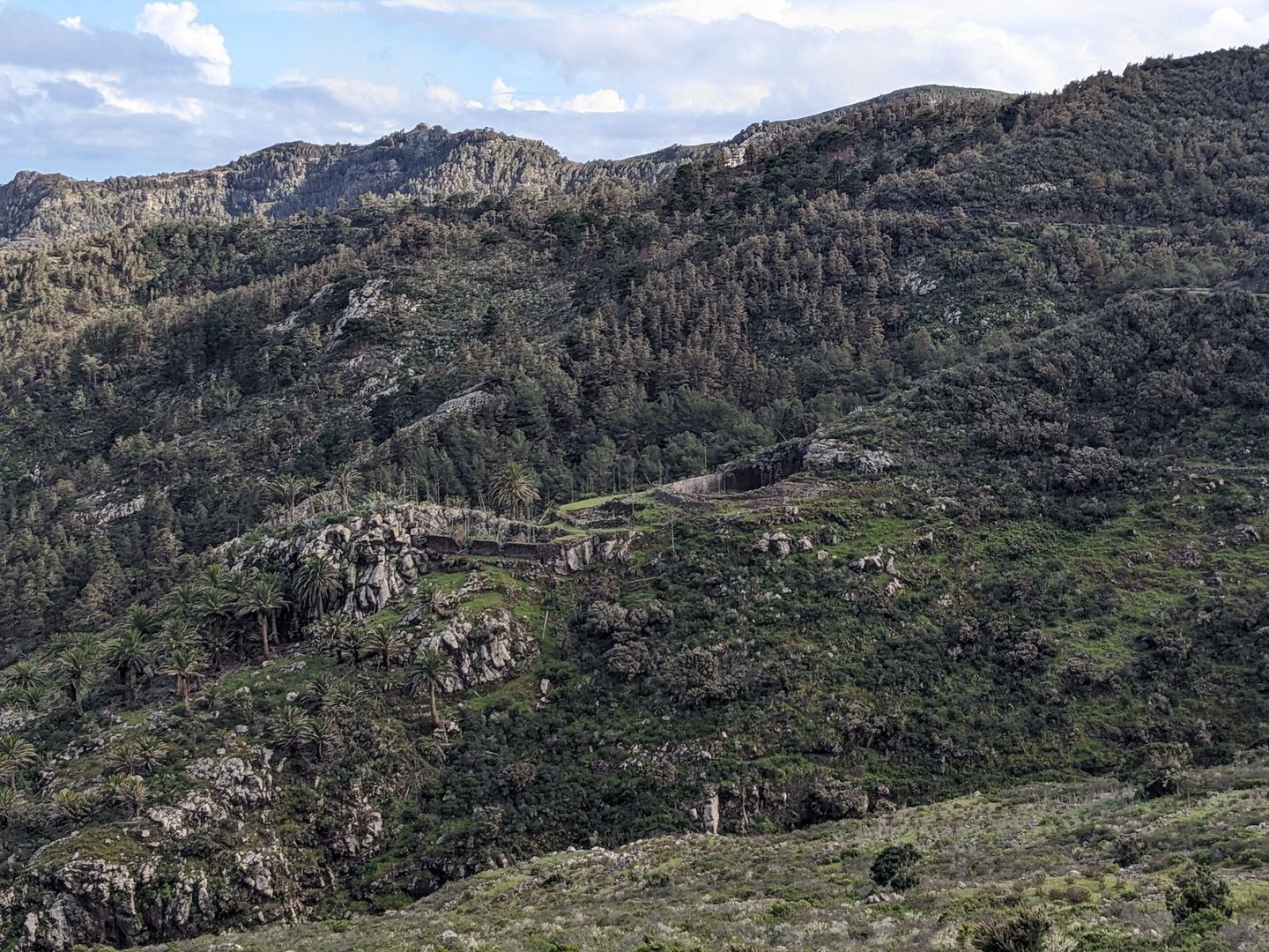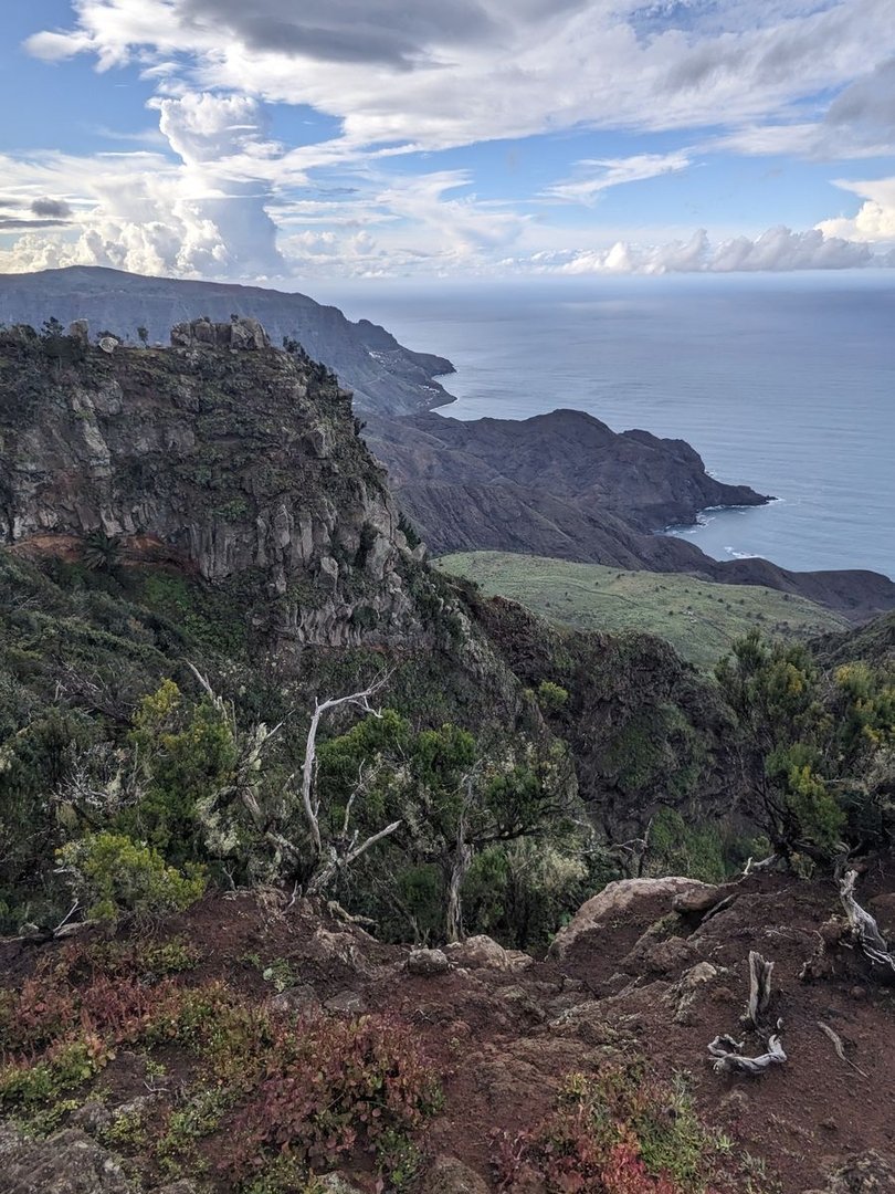 Aber es ist noch deutlich zu früh für einen Halt, also laufe ich weiter. Es wird wieder bergiger. Immer wieder mal ein Schauer. Grob bei Montaña Ismael treffe ich auf die erste Straße und zwei Britinnen. Wird Zeit fürs Mittagessen. “Beim nächste Schatten” denke ich, was noch länger dauern wird. Es geht noch bergig auf einem Singeltrail weiter bis der Weg nach unten geht und eine Pistenstraße trifft. Der folge ich, sicher 10km lang an einem dichten verwachsenen Wald entlang. Die auf Mapy eingezeichnete Quelle ist verbaut und man kommt nicht ran. An sich egal weil eh alle 30min ein Bach mit Wasser fließt. Doof nur dass ich meinen Filter daheim gelassen habe. An sich soll die Insel ja staubtrocken sein. Der Pistenweg zieht sich gemütlich immer höher. Bei Casas del Helechal ein verlassener Bauernhof mit Terrassenanlagen. Sonst steil oder dichter Wald. Bei Riscos de Juel scheine ich final oben zu sein. Ein toller Platz mit genialer Aussicht, aber es türmen sich (noch gutmütige weiße) Gewitterwolken auf — vielleicht doch besser absteigen.