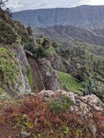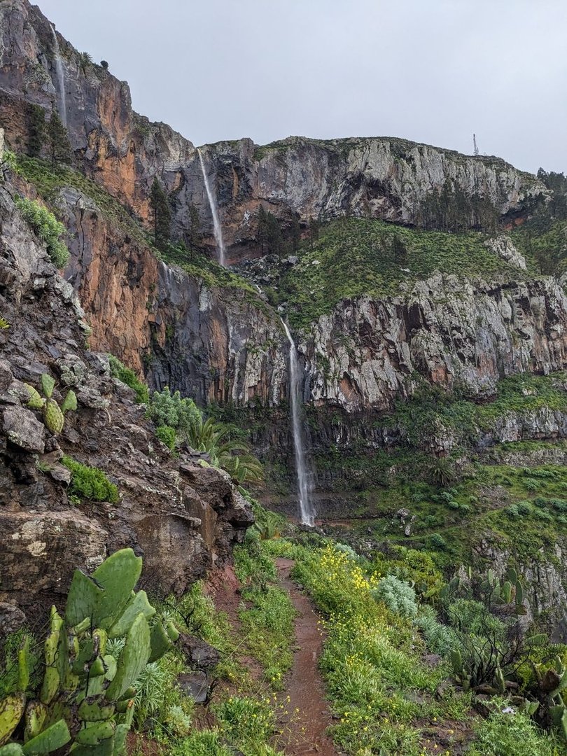 Nachdem ich das Dorf verlassen habe, helfe ich zwei Touristen einen betagten Herren, der sich wohl arg überschätzt hat, eine steile Passage zu meistern. Zu dritt hieven wir den Großvater hinunter. Ab der Iglesia de Los Santos Reyes, geht es wieder richtig Steil hoch bis Degollada del Cerrillal. Meinefressealter. Das zieht sich. Der Regen von gestern hat in Starkwind gewechselt und ich muss zu Teilen wirklich aufpassen dass es mich nicht weg weht. Ab welcher Windstärke bekommt man eigentlich die Carbonstöcke nicht mehr auf den Boden? 5 Bft? Dabei immer wieder die Aussicht auf zwei riesige Wasserfälle auf der anderen Seite. Oben angekommen wird es erstmal entspannter. Es geht vorbei an Terassenanlagen, ein rauschender Bach will passiert werden. Dann leicht rauf zur Ermita de Gerián. Hätte ich ein freistehendes Zelt, wäre das sicher ein schöner Ort um zu bleiben.